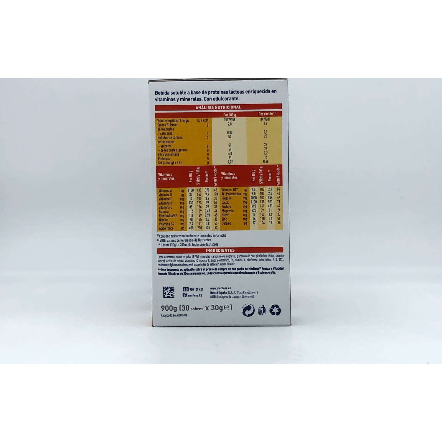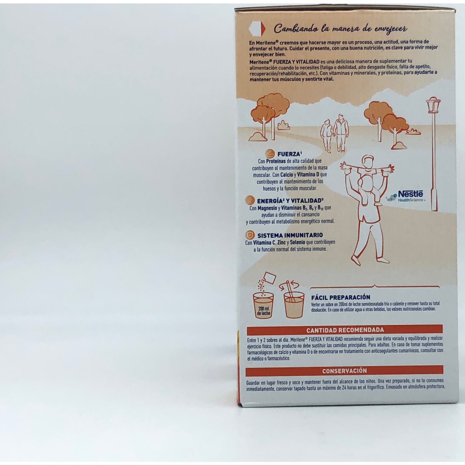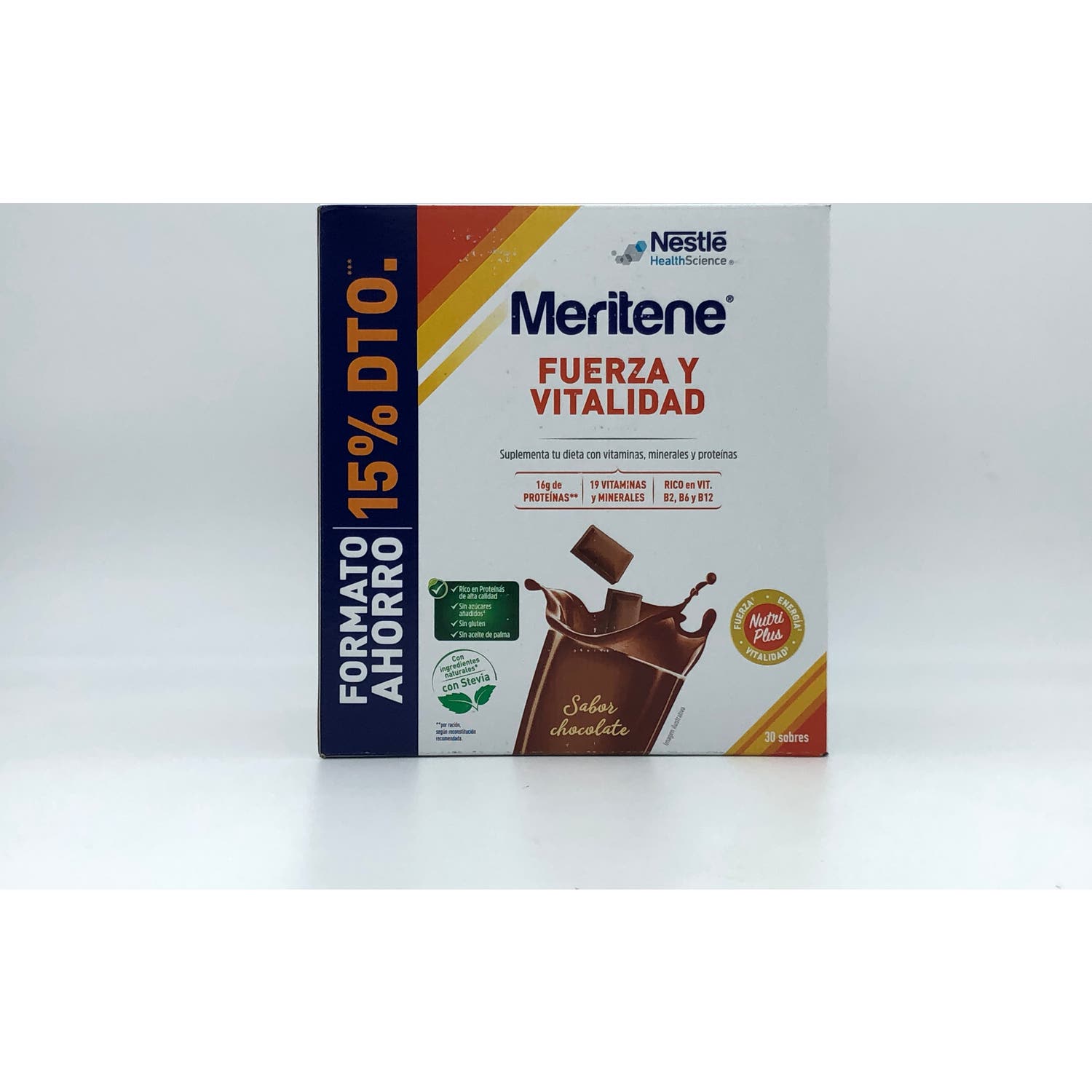 Meritene Fuerza y Vitalidad 15 Sobres + 15 Sobres Sabor Chocolate es un complemento alimenticio que contribuye a disminuir el cansancio y la fatiga. Se presenta en formato polvo para diluir y obtener un delicioso batido.