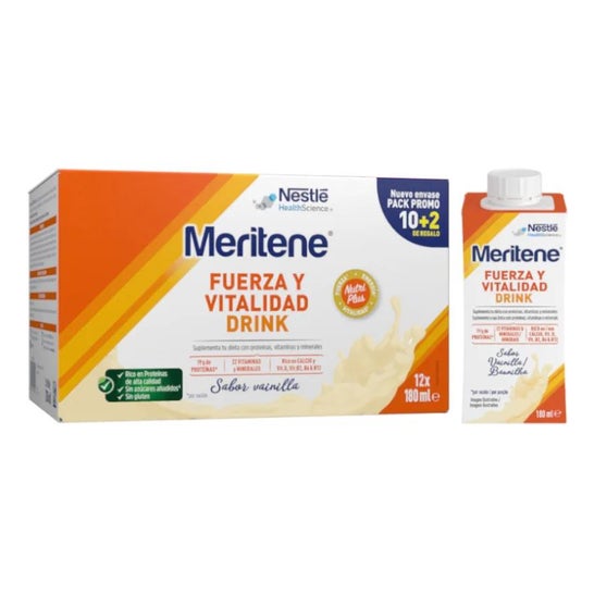 Meritene Fuerza y Vitalidad Drink Vainilla 12x125ml es un complemento alimenticio rico en proteínas, vitaminas y minerales que contribuyen a combatir la sensación de cansancio, fatiga y debilidad muscular. Su presentación en formato batido los hace cómodos de tomar en cualquier parte y momento del día. Asimismo, ayuda a complementar la dieta en caso de que exista un desgaste físico elevado o exista un desequilibrio nutricional. Contiene 12 botellitas de 125ml cada una.