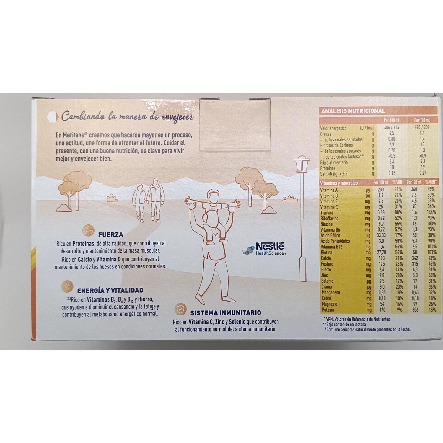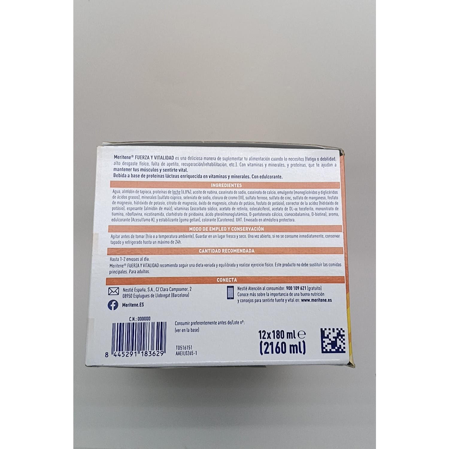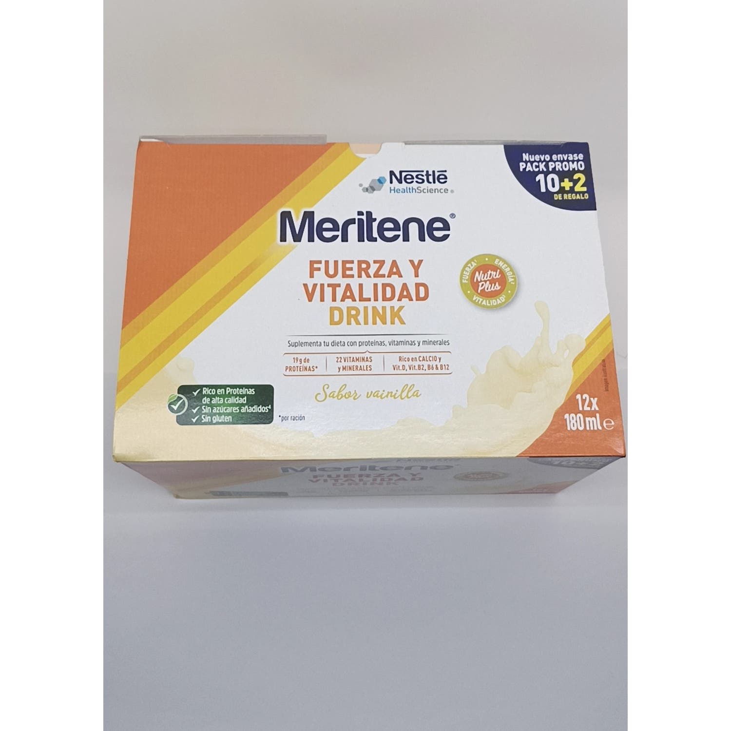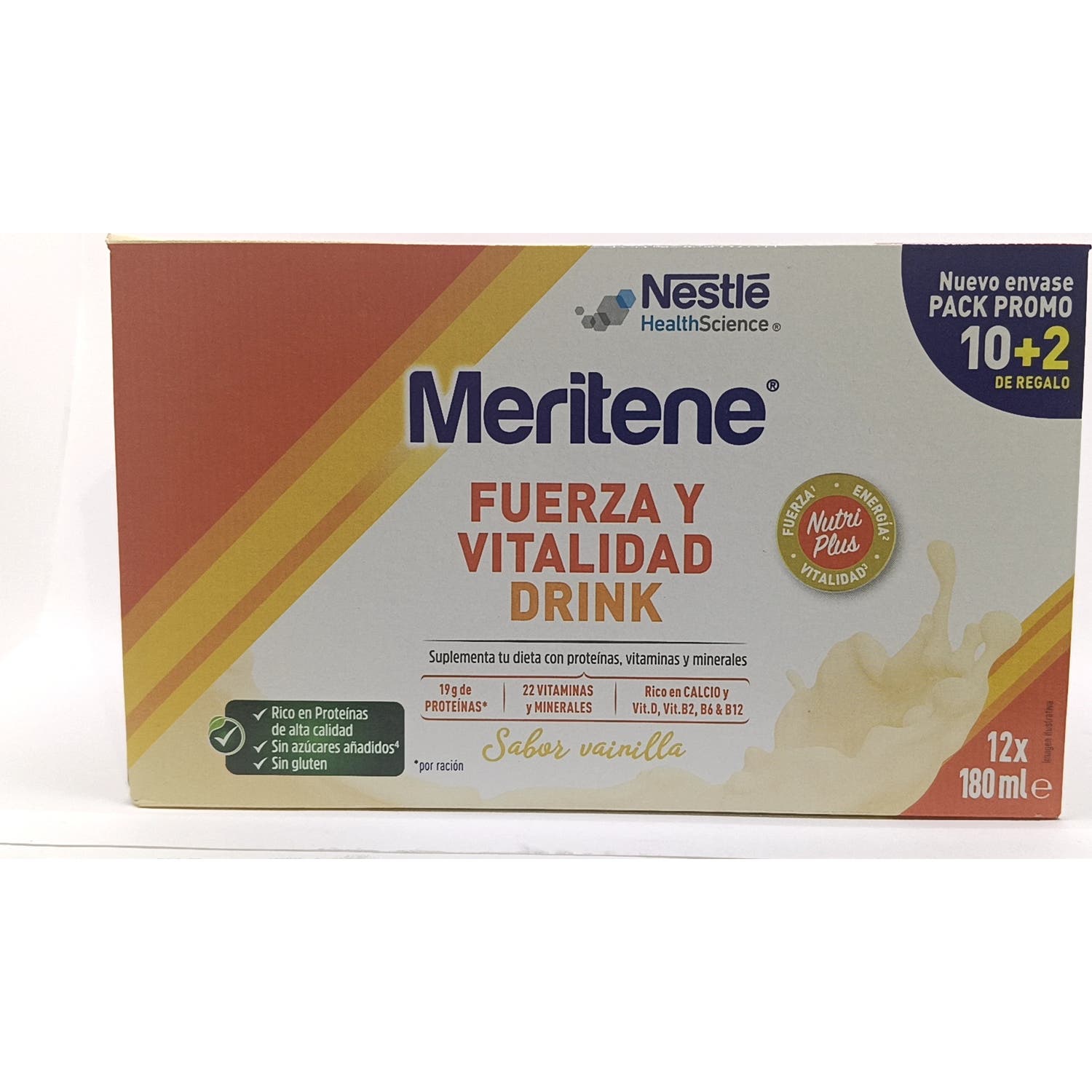 Meritene Fuerza y Vitalidad Drink Vainilla 6x180ml es un complemento alimenticio bebible a base de proteínas, vitaminas y minerales que dan soporte a disminuir el cansancio, la fatiga y al normal funcionamiento del sistema inmunitario.