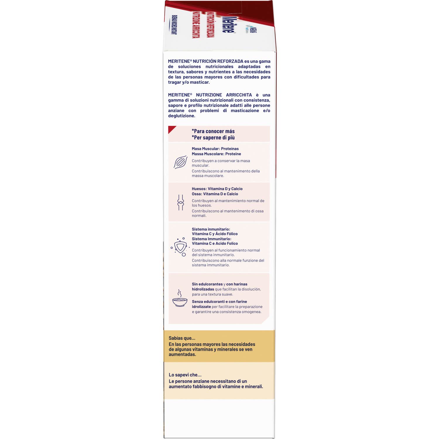 Meritene® Nutrición Reforzada Buenas Noches Instant es un plato principal, a base de cereales, altamente nutritivo y de fácil ingesta. Rico en proteínas con textura adaptada y enriquecido en vitaminas y minerales. Sin sacarosa añadida*. Con edulcorante.