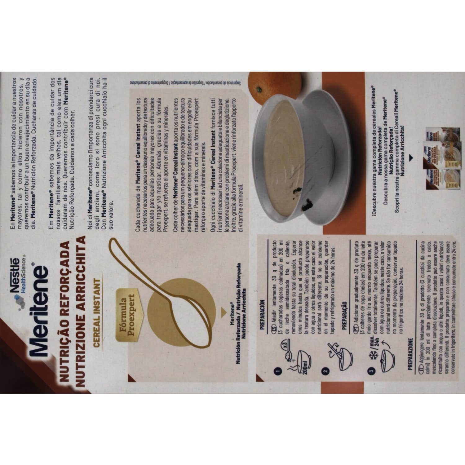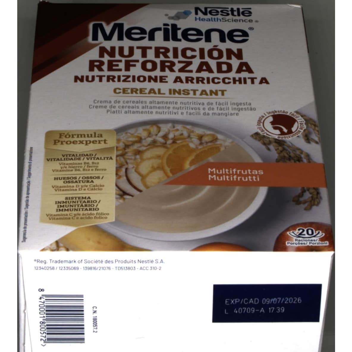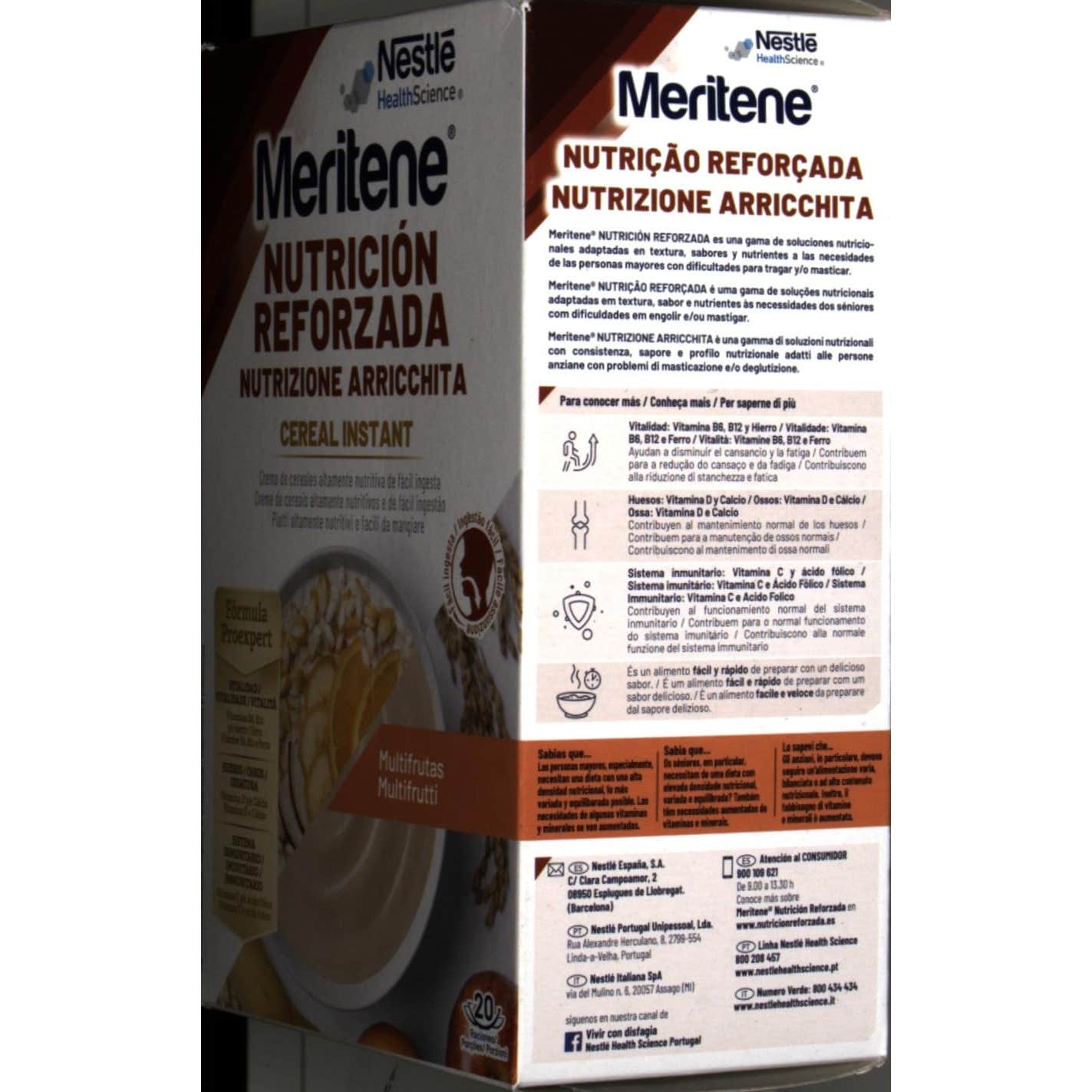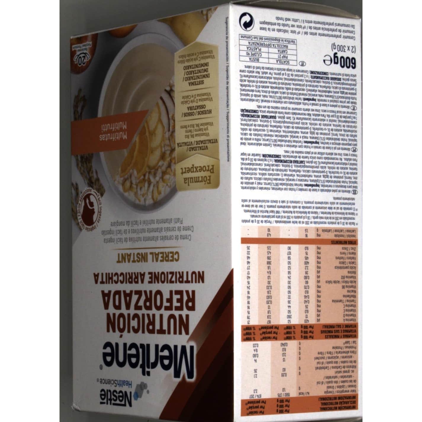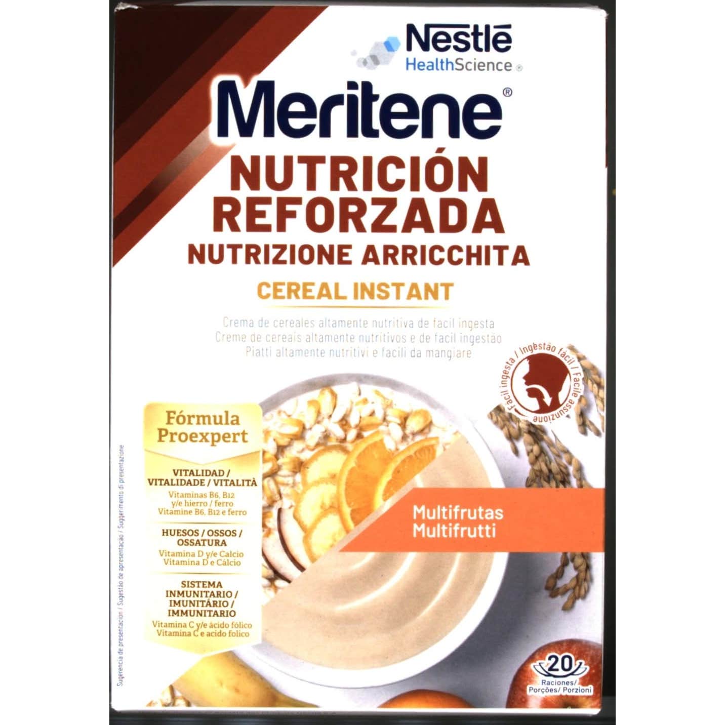 Nestlé Meritene Nutrición Reforzada Cereal Instant Multifrutas 600g es una crema de cereales de fácil ingesta rica que aporta vitalidad por su contenido en vitaminas y Hierro. También contiene vitamina D y Calcio, para el mantenimiento de la salud muscular y ósea.