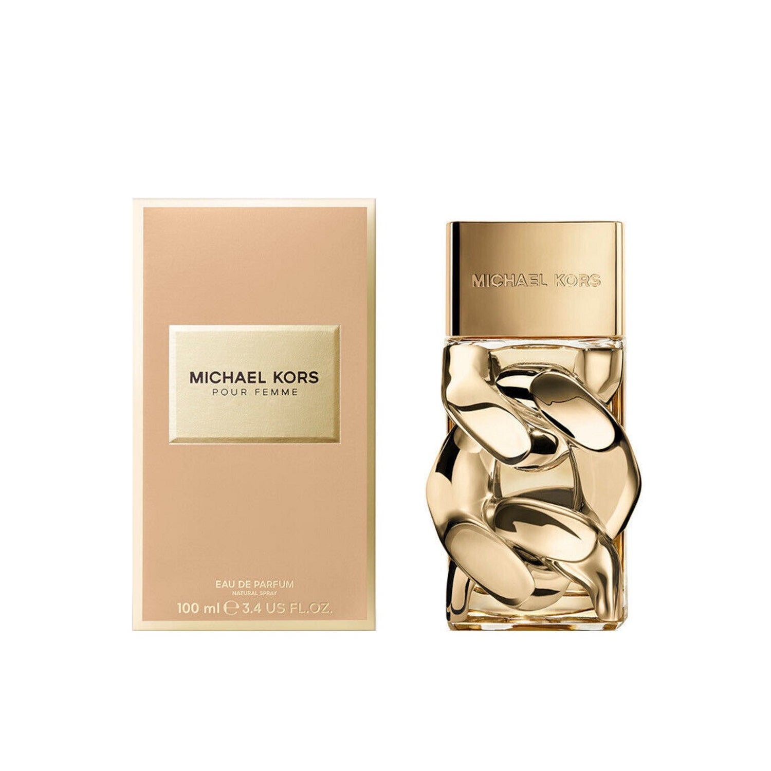 Michael Kors pour Femme Eau de Parfum 100ml es una fragancia que evoca fuerza y sensualidad. Su diseño incluye un frasco adornado con cadenas, que refleja una estética de glamour y poder.
