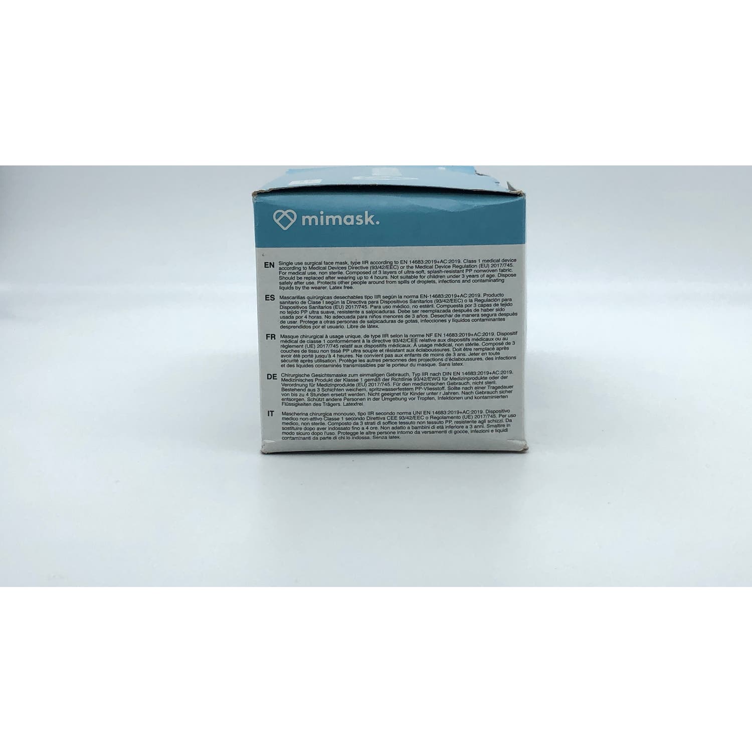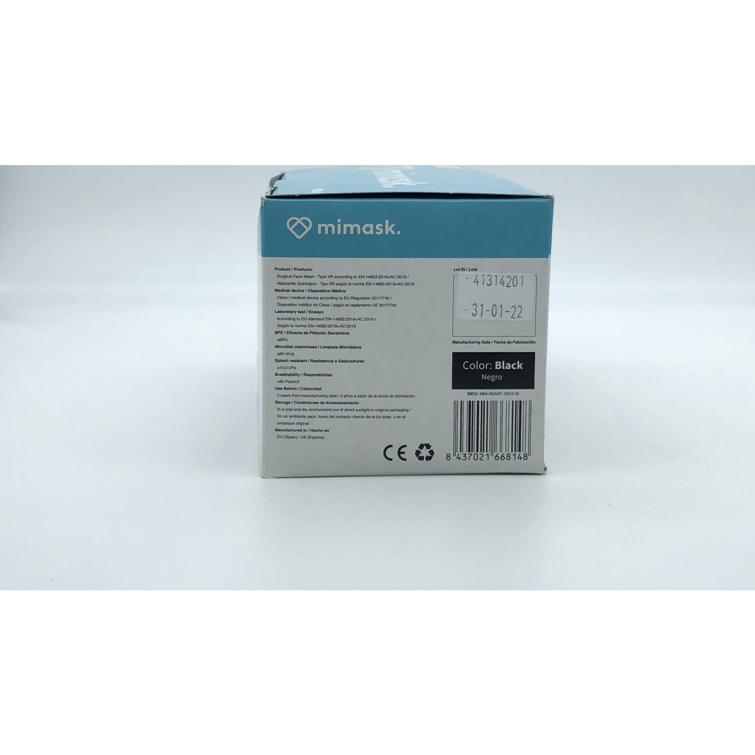 MiMask Mascarillas Quirúrgicas NR Tipo IIR Negro 50uds es un pack de mascarillas quirúrgicas de tipo IIR que limitan la propagación del contagio, resistentes a salpicaduras, como sangre u otros líquidos biológicos. Están compuestas por 3 capas de tejido no tejido PP ultra-suave, y ofrecen filtración bacteriana (BFE) ≥98%. Los elásticos para las orejas mantienen la mascarilla ajustada cómodamente a la cara, y permiten que pueda ser retirada fácilmente. Acomodando la barrita de ajuste para la nariz, la mascarilla sella el área para mayor protección.