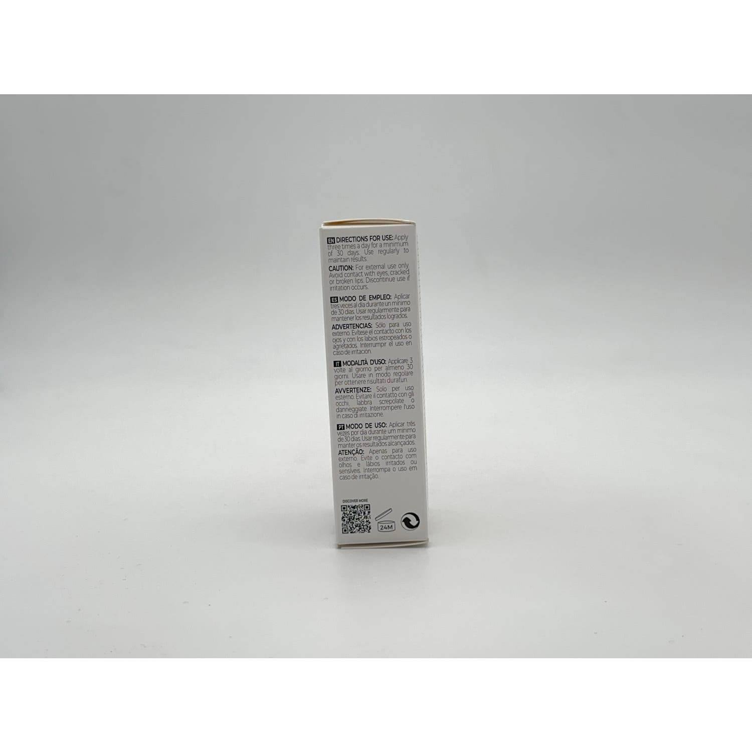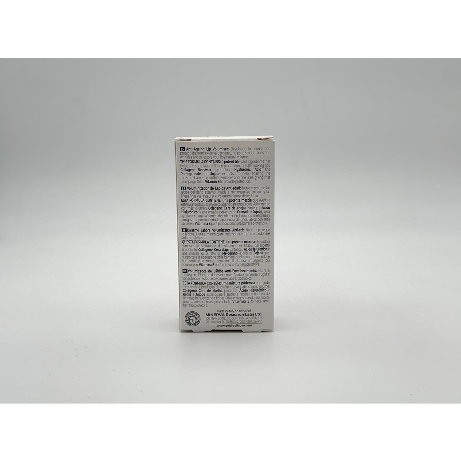 Barra de labios voluminizadora. Su fórmula ha sido diseñada con una potente mezcla de oligopéptidos que ayudan a conseguir una apariencia de más volumen a los labios, mejorando su aspecto y ayudando a suavizar líneas de expresión y arrugas.