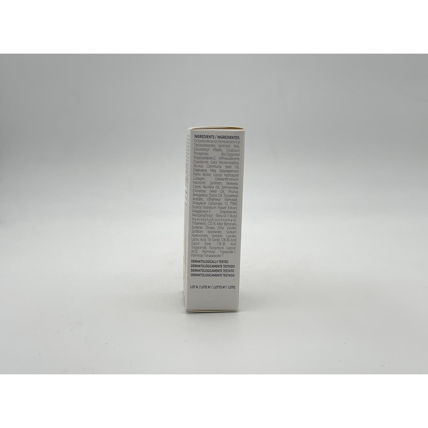 ACEITE OLUS (VEGETAL), PARAFFINUM LIQUIDUM (ACEITE MINERAL), CERA SINTÉTICA ACEITE DE COCO HIDROGENADO, RICINUS COMMUNIS (CASTOR) ACEITE DE SEMILLA, CERA ALBA (CERA DE ABEJA), MANTEQUILLA DE BUTYROSPERMUM PARKII (SHEA), PALMITATO DE CETILO, PRUNUS AMYGDALUS DULCIS (ALMENDRA DULCE) ACEITE, METOXICINAMATO DE ETILHEXILO, CERA MICROCRISTALINA HIDROGENADA, PALMITATO DE ETILHEXILO, MICA, AQUA (AGUA), GLICERIL UNDECILENATO, NÁCAR (NÁCAR) POLVO, DIÓXIDO DE TITANIO, PERFUME (FRAGANCIA), TRIBEHENINA, ÁCIDO ESTEÁRICO, TOCOFERILO ACETATO, ISOESTEARATO DE SORBITÁN, PROPILENGLICOL, BENZOATO DE BENCILO, ÁCIDO LÁCTICO, CUMARINA, CINAMATO DE BENCILO, COLÁGENO DE PESCADO, BHT, OLIGOPÉPTIDO DE PALMITOILO.*CONTIENE ACEITE DE ALMENDRAS, CERA DE ABEJAS Y COLÁGENO DE PESCADO.