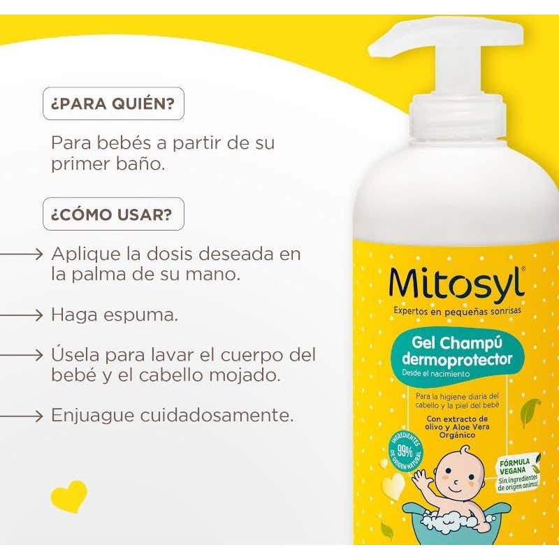 Mitosyl Gel Champú Dermoprotector 490ml es un gel-champú 2 en 1 para para bebés y niños que da soporte a las defensas naturales del organismo y favorece el equilibrio de la microbiota.