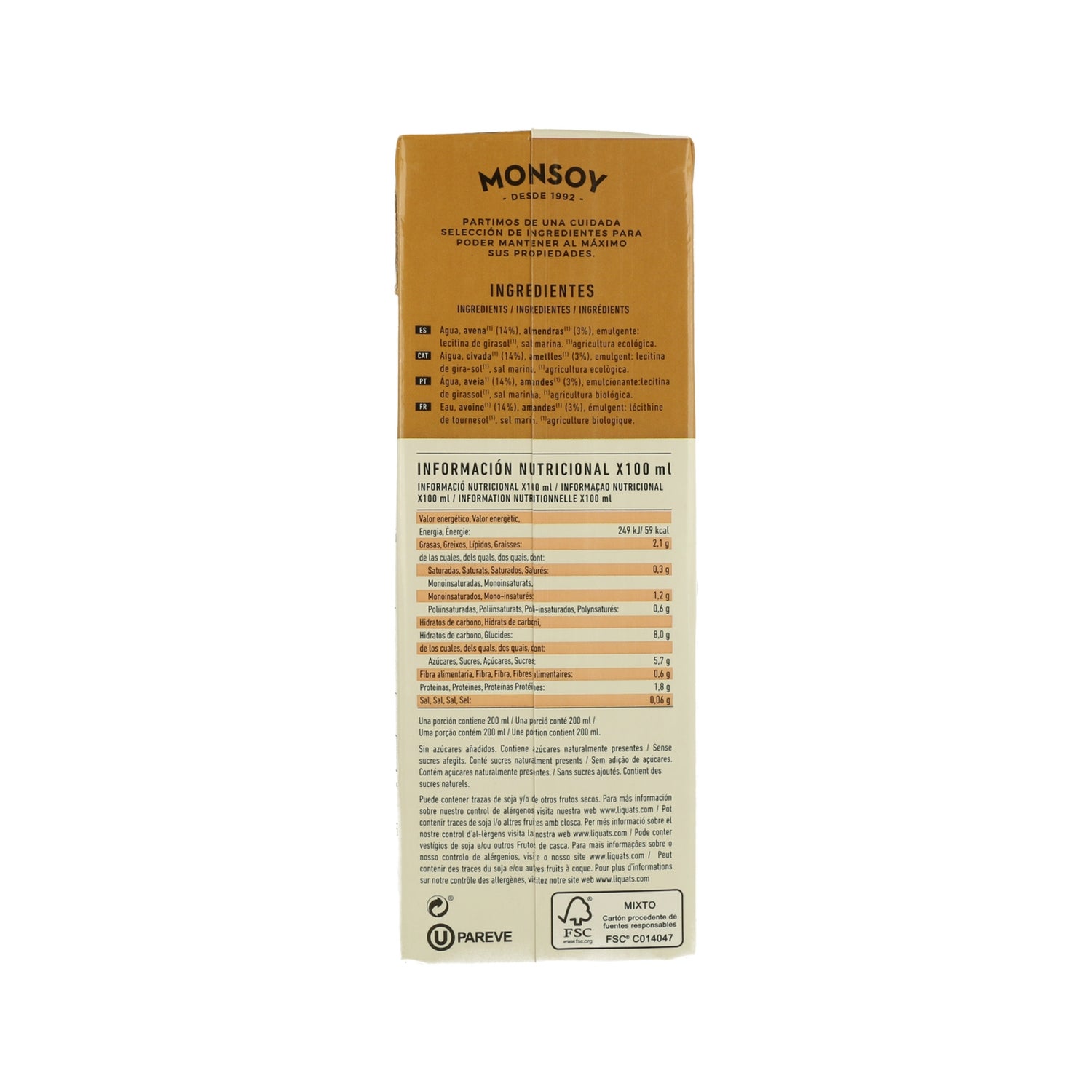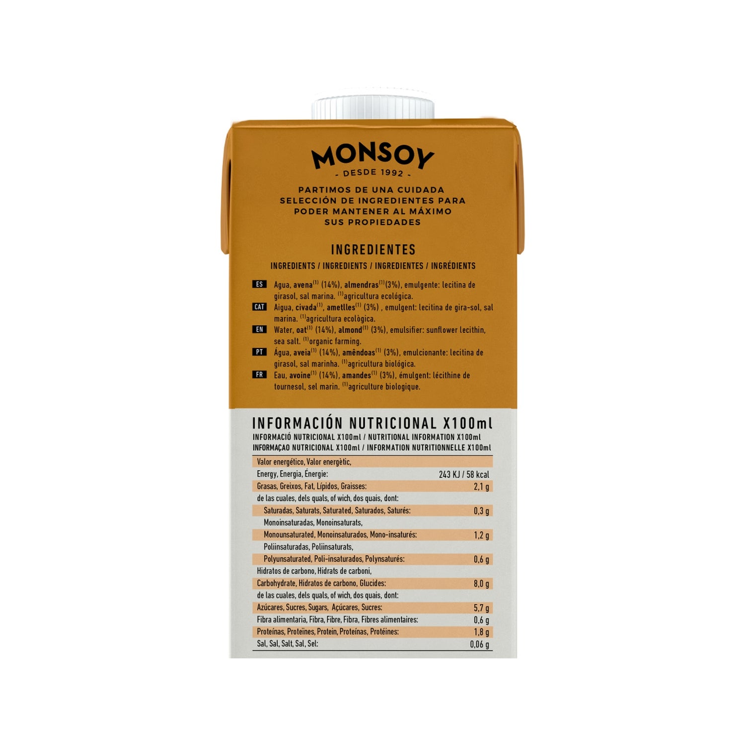 Bebida de almendras con un delicioso sabor, tiene un alto contenido de grasas insaturadas como el ácido oleico y el linoleico. En este caso se substituyeron las grasas saturadas por insaturadas, lo que permite mantener los niveles adecuados de colesterol sanguíneo. Tiene bajo contenido de sodio que favorece el mantenimiento de la tensión arterial de manera adecuada. Las almendras dulces son selccionadas y son trituradas en agua para mantener todos sus nutrientes, además del sabor, aroma, cuerpo y textura. También se le agrega una cantidad de azúcar óptima. Ideal para cualquier momento del día.
