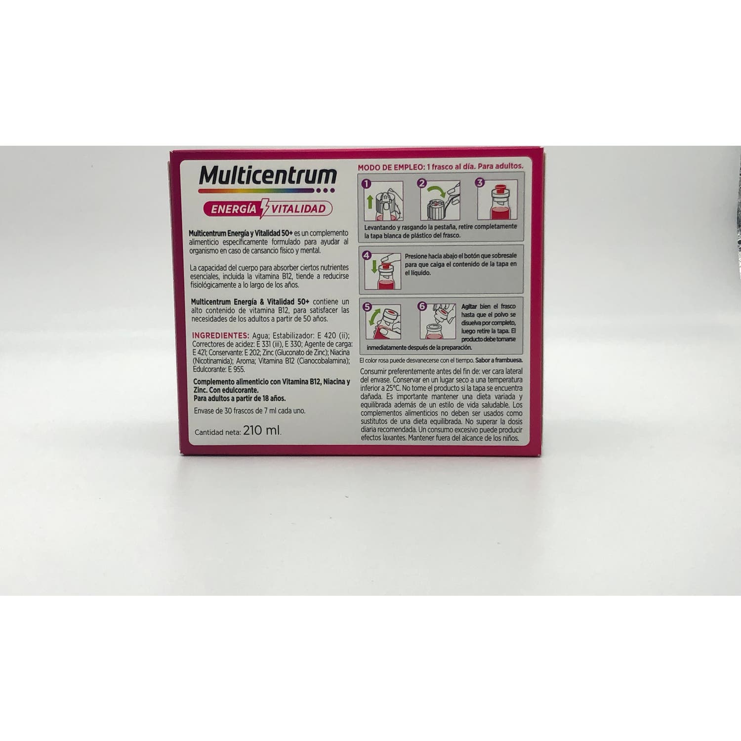Multicentrum Energía y Vitalidad 50+ Frambuesa 30x7ml es un complemento alimenticio diseñado para satisfacer las necesidades nutricionales de las personas mayores de 50 años, gracias a su enriquecido contenido en vitamina B12. Este producto está formulado específicamente para apoyar al organismo en situaciones de fatiga física y mental, ayudando a mejorar la concentración y a combatir el cansancio.