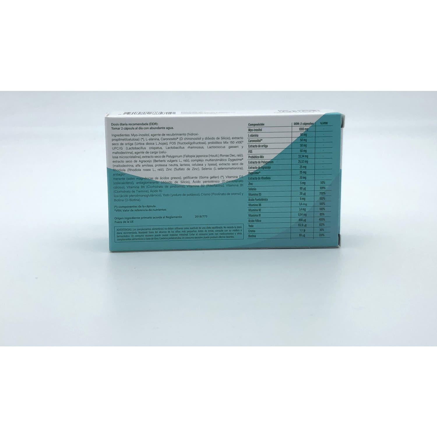 Inositol, L-Alanina, D-Quiro-Inositol, Ortiga Extracto Seco, Probiótico MIX 150B (L. CRISPATUS+L.RHAMNOSUS+ L.GASSERI), Tansresveratrol, Berberina HCl, Amilasa, Rodiola, Extracto Seco, Sulfato de zinc, Selenometionina, Colecalciferol 100.000 UI/g (Vitamin D3), Ácido pantoténico-Vitamina B5, Clorhidrato de piridoxina (Vitamina B6), Riboflavina (Vitamina B2), Tiamina HCl (vitamina B1), Ácido fólico (Vitamina B9), Yoduro potásico, Picolinato de cromo, D-biotina (Biotina), Actilight ™ 950 P (Fructooligosacáridos).