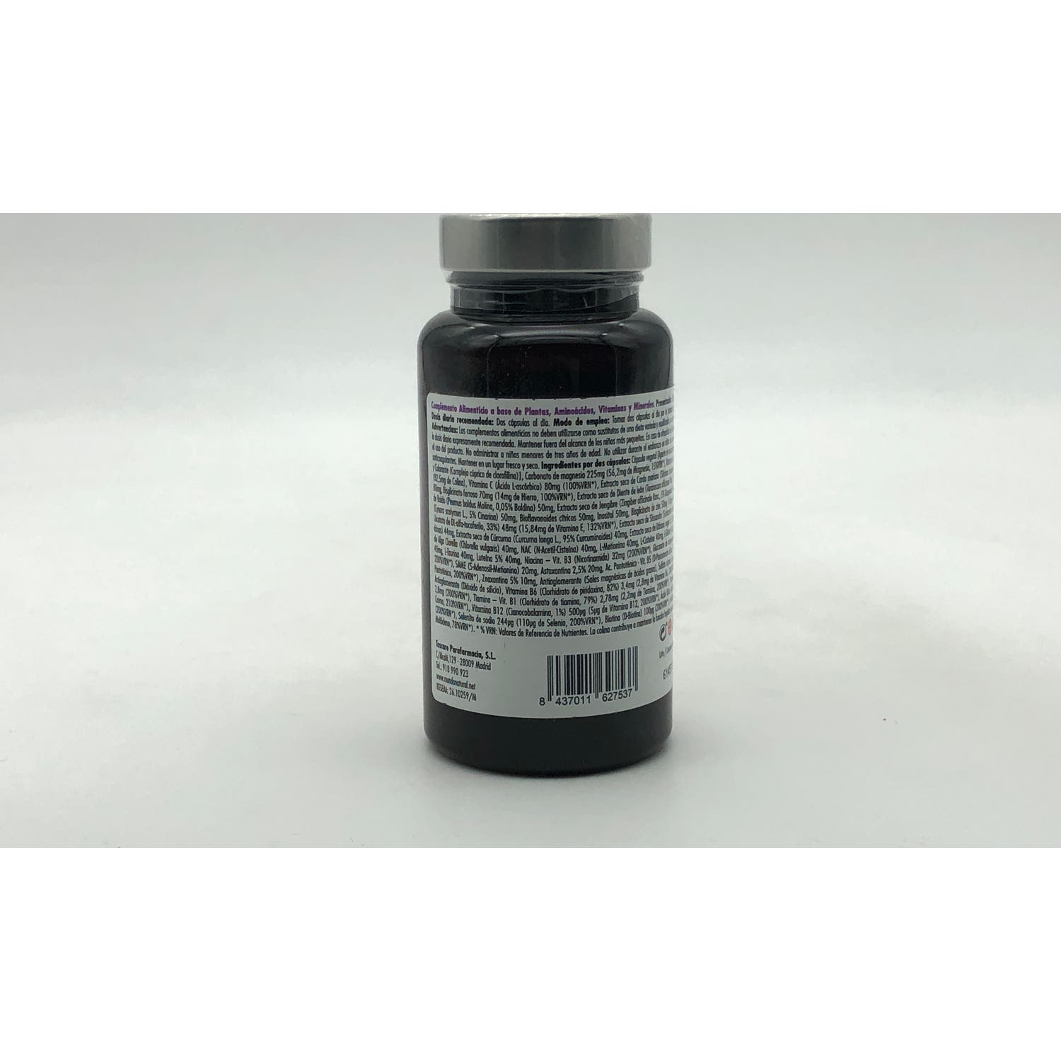 Ingredientes por dos cápsulas: Cardo mariano (Silybum marianum (L.) Gaertn., 80% Silimarina) 80 mg. Diente de león (Taraxacum officinale Web., 2% Inulina) 50 mg. Boldo(Peumus boldus Molina, 0,05% Boldina) 50 mg. Jengibre (Zingiber officinale Rosc., 5% Gingeroles) 50 mg. Alcachofa (Cynara scolymus L., 5% Cinarina) 50 mg. Shisandra (Schisandra chinensis (Turcz.) Baill., 2% Shizandrinas) 44 mg. Rábano negro 5:1 (Raphanus sativus L.) 40 mg. Cúrcuma (Cúrcuma longa L., 95% Curcuminoides) 40 mg. Bitartrato de colina (40% Colina) 206,25 mg. Inositol 50 mg. Biotina (D-Biotina) 100 µg (200%VRN). Bioflavonoides cítricos 50 mg. NAC (N-Acetil-Cisteína) 40 mg. SAME (S-Adenosil-Metionina) 20 mg. Vitamina B1 (Clorhidrato de tiamina, 79%) 2,78 mg (2,2mg de Vitamina B1, 200%VRN). Vitamina B2 (Riboflavina) 2,8 mg (200%VRN). Vitamina B3 (Nicotinamida) 32 mg (200%VRN). Vitamina B5 (D-Pantotenato de calcio, 92,5%) 13,04 mg (12mg de Vitamina B5, 200%VRN). Vitamina B6 (Clorhidrato de piridoxina, 82%) 3,4 mg (2,8mg de Vitamina B6, 200%VRN). Ácido fólico (Ácido pteroilmonoglutámico) 400 µg (200%VRN). Vitamina C (Ácido L-ascórbico) 80 mg (100%VRN). Vitamina E(Acetato de DL-alfa-tocoferol, 50%) 48 mg (24mg de Vitamina E, 200%VRN). Alga Clorella (Chlorella vulgaris) 40 mg. Luteína 5% 40 mg. Astaxantina 2,5% 20 mg. Zeaxantina 5% 10 mg. L-Metionina 40 mg. L-Cisteína 40 mg. L-Glicina 40 mg. L-Arginina 40 mg. L-Glutamina 40 mg. L-Taurina 40 mg. Carbonato de magnesio 225 mg (56,2 mg de Magnesio, 15% VRN*). Bisglicinato de Zinc 50 mg (10mg de Zinc, 100% VRN). Gluconato de manganeso 32 mg (4mg de Manganeso, 200%VRN). Sulfato de cobre 5 mg (2mg de Cobre, 200%VRN). Bisglicinato ferroso 70 mg (14mg de Hierro, 100%VRN). Picolinato de cromo 700 µg (80µg de Cromo, 200 %VRN). Selenito de sodio 244 µg (110µg de Selenio, 200%VRN). Molibdato de amonio 100 µg (50 µg de Molibdeno, 100%VRN). Antiaglomerantes: Estearato de magnesio y Dióxido de silicio. Cápsula: Gelatina y Colorante (E-171).
