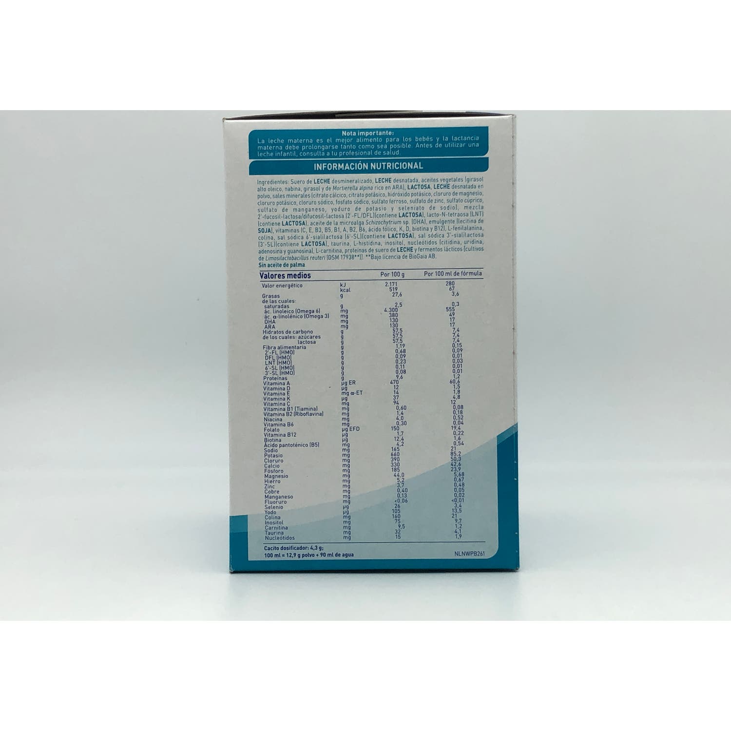 Suero de LECHE desmineralizado, LECHE desnatada, aceites vegetales (girasol alto oleico, nabina, girasol y de Mortierella alpina rico en ARA), LACTOSA, LECHE desnatada en polvo, sales minerales (citrato cálcico, citrato potásico, hidróxido potásico, cloruro de magnesio, cloruro potásico, cloruro sódico, fosfato sódico, sulfato ferroso, sulfato de zinc, sulfato cúprico, sulfato de manganeso, yoduro de potasio y seleniato de sodio), mezcla 2′-fucosil-lactosa/difucosil-lactosa (2’-FL/DFL)(contiene LACTOSA), lacto-N-tetraosa (LNT) (contiene LACTOSA), aceite de la microalga Schizochytrium sp.(DHA), emulgente (lecitina de SOJA), vitaminas (C, E, B3, B5, B1, A, B2, B6, ácido fólico, K, D, biotina y B12), L-fenilalanina, colina, sal sódica 6'-sialilactosa (6'-SL)(contiene LACTOSA), sal sódica 3'-sialilactosa (3'-SL)(contiene LACTOSA), taurina, L-histidina, inositol, nucleótidos (citidina, uridina, adenosina y guanosina), L-carnitina, proteínas de suero LECHE y fermentos lácticos [cultivos de Limosilactobacillus reuteri (DSM 17938**)]