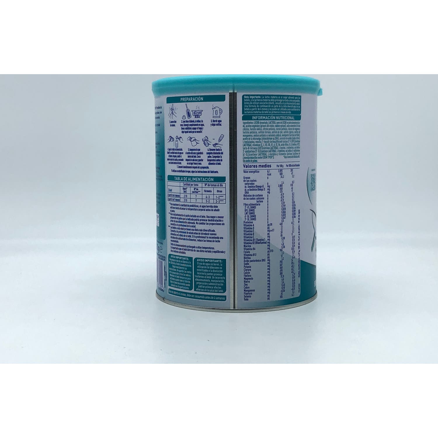 Leche desnatada, lactosa, suero de leche en polvo, aceites vegetales (girasol alto oleico, coco, nabina y girasol), sales minerales (citrato cálcico, citrato potásico, fosfato cálcico, cloruro de magnesio, citrato sódico, cloruro sódico, sulfato ferroso, sulfato de zinc, sulfato cúprico, sulfato de manganeso, yoduro potásico y seleniato sódico), aceite de pescado (DHA), emulgente (lecitina de soja), , vitaminas (C, E, nicotinamida, pantotenato cálcico, B1, B2, A, B6, ácido fólico, K, D, biotina y B12), 2'-fucosil-lactosa (2’-FL) (contiene leche) y fermentos lácticos [cultivos de Lactobacillus reuteri (DSM 17938*)].