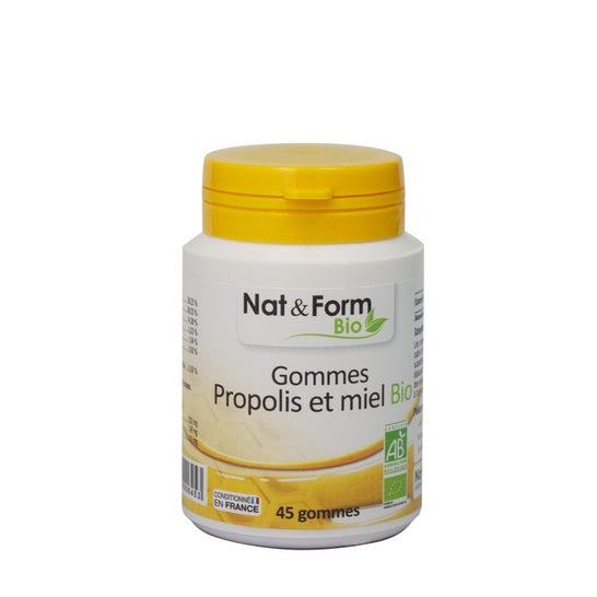 Nat&Form Bio Propolis Gums 45 es un complemento natural para el cuidado de la garganta y el bienestar respiratorio. Estas gominolas ecológicas, ideales para adultos y adolescentes, combinan propóleo, miel y eucalipto, proporcionando un alivio eficaz ante molestias en la garganta.