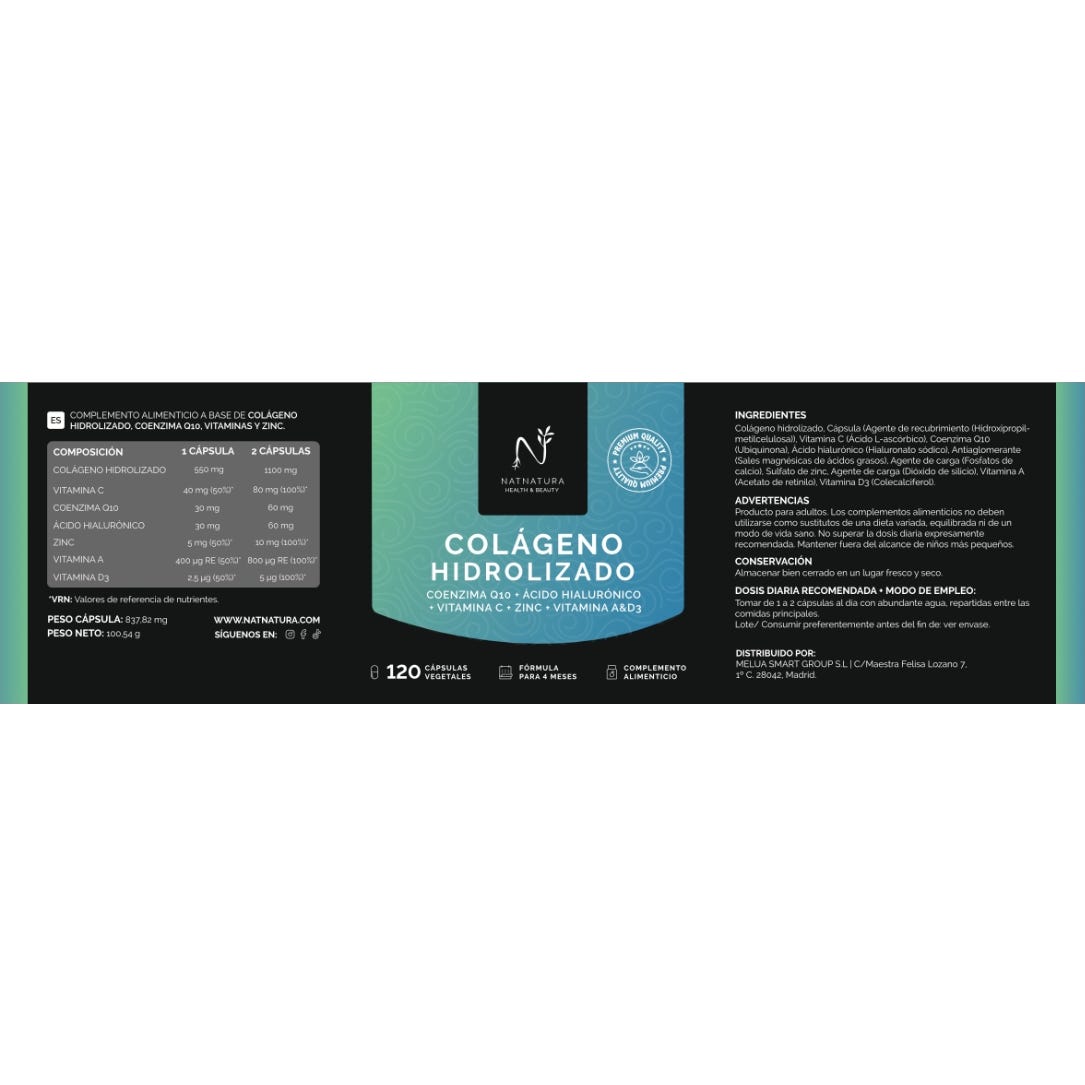 Fórmula avanzada con colágeno hidrolizado, ácido hialurónico, vitaminas y coenzima Q10 que mejora la elasticidad, hidratación y firmeza de la piel, fortaleciendo cabello y uñas.