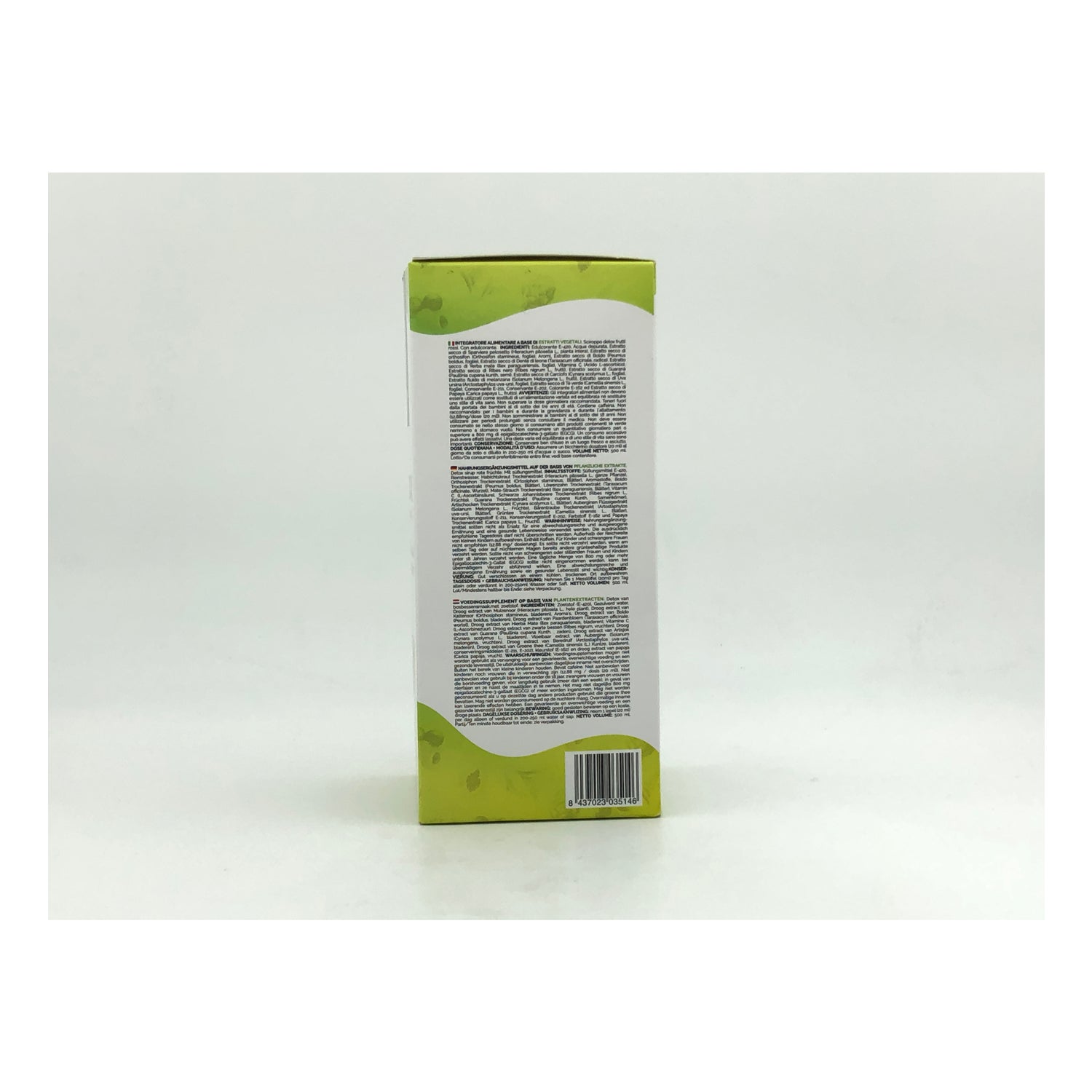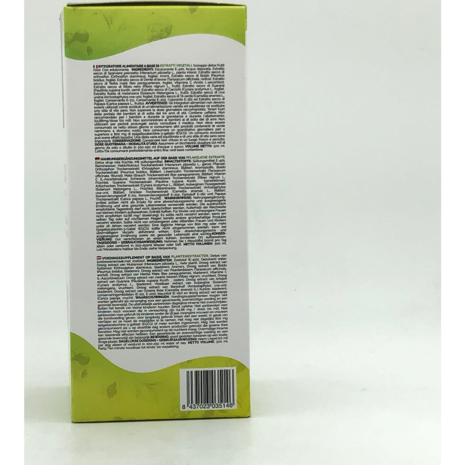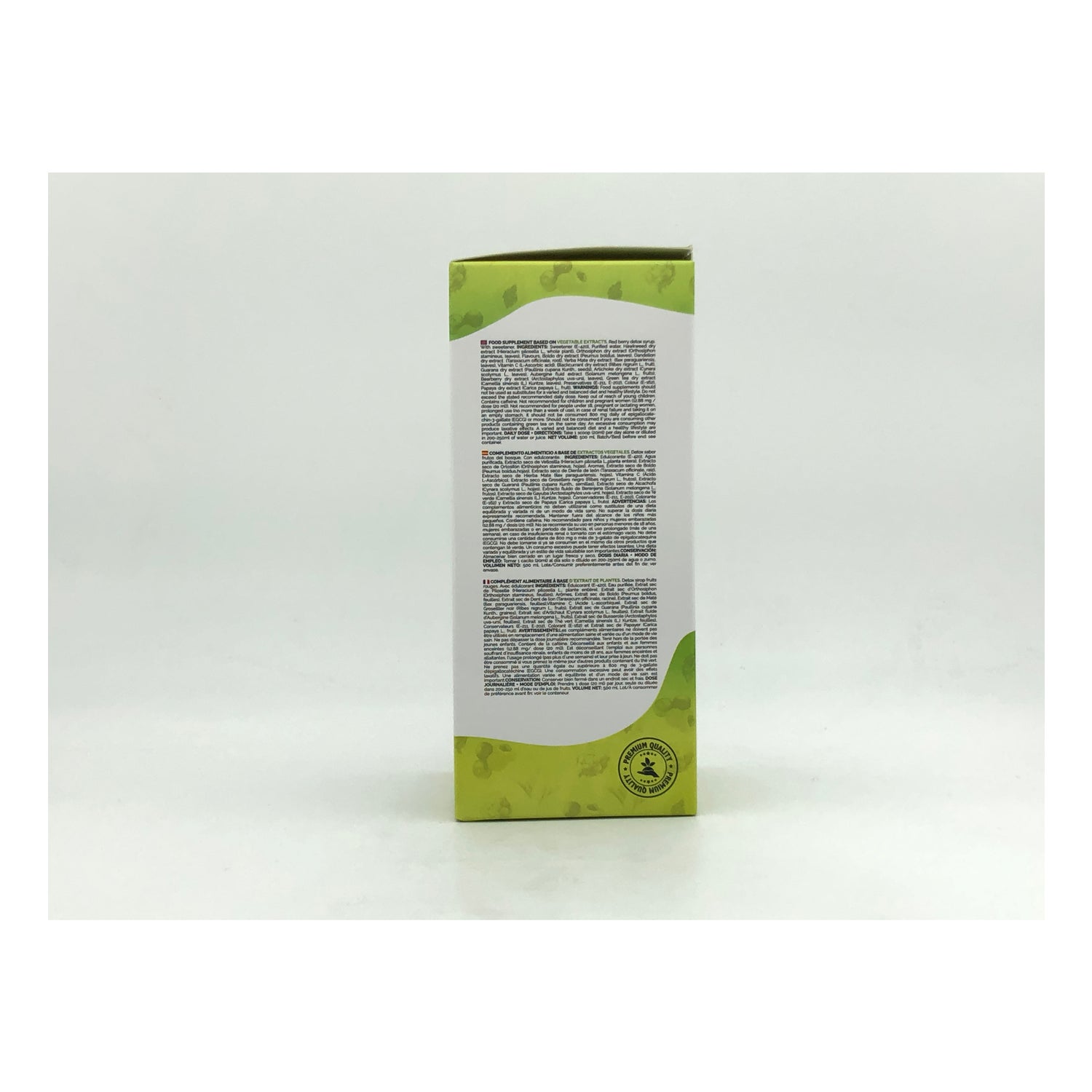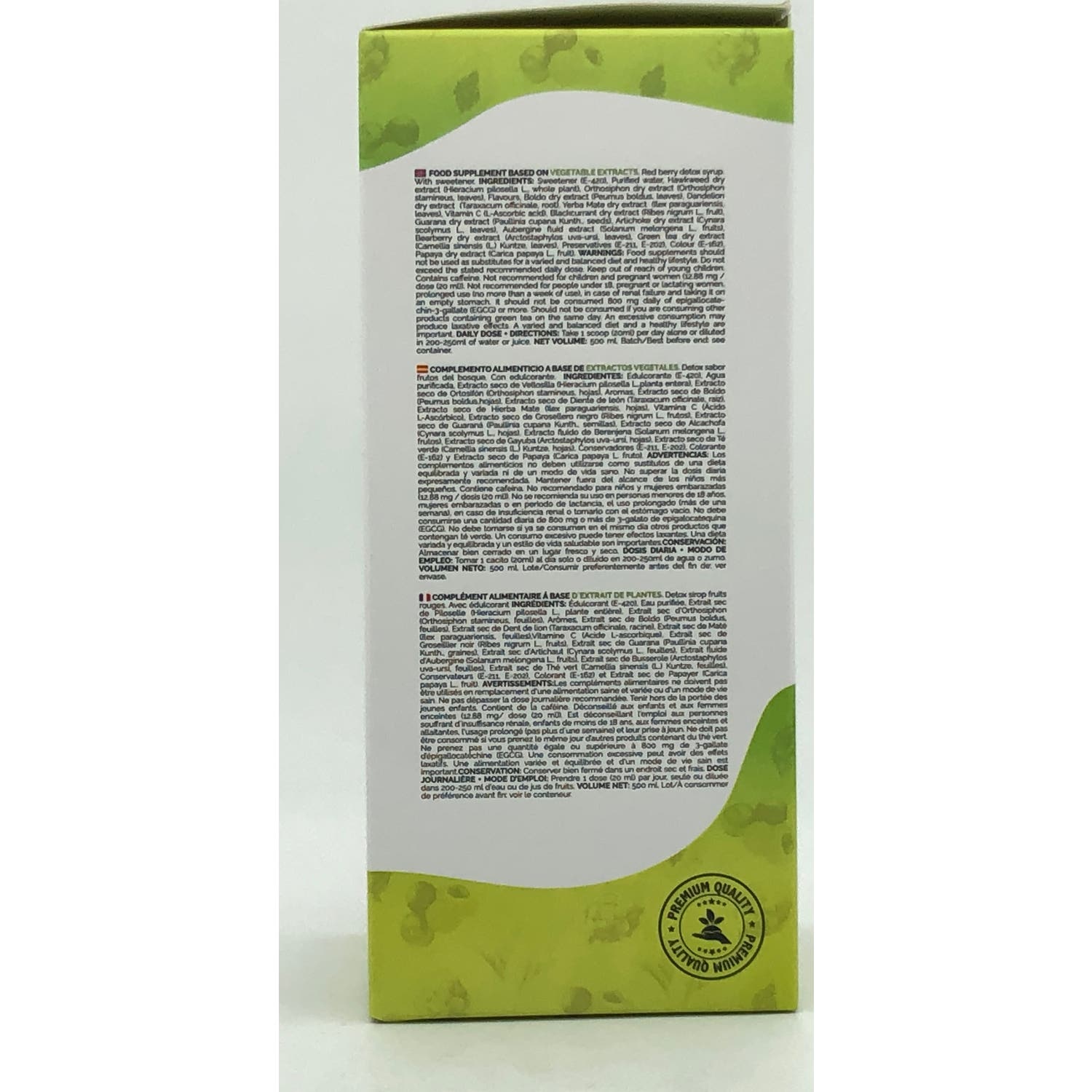Edulcorante E-420, Agua purificada, Extracto seco de Vellosilla (Hieracium pilosella, planta entera), Extracto seco de Ortosifón (Ortosiphon stamineus, hojas), Aromas, Extracto seco de Boldo (Peumus boldus, hojas), Extracto seco de Diente de león (Taraxacum officinale, raíz), Extracto seco de Hierba mate (Ilex paraguariensis, hojas), Vitamina C (ácido L-ascórbico), Extracto seco de Grosellero negro (Ribes nigrum, frutos), Extracto seco de Guaraná (Paullina cupana, semillas), Extracto seco de Alcachofa (Cynara scolymus, hojas), Extracto fluido de Berenjena (Solanum Melongena, frutos), Extracto seco de Gayuba (Artostaphylos uva-ursi, hojas), Extracto seco de Te verde (Camelia sinensis, hojas), Conservante E-211, Conservante E-202, Extracto seco de Ruibarbo (Rheum palmatum, raíz), Colorante E-162 y Extracto seco de Papaya (Carica papaya, fruto).