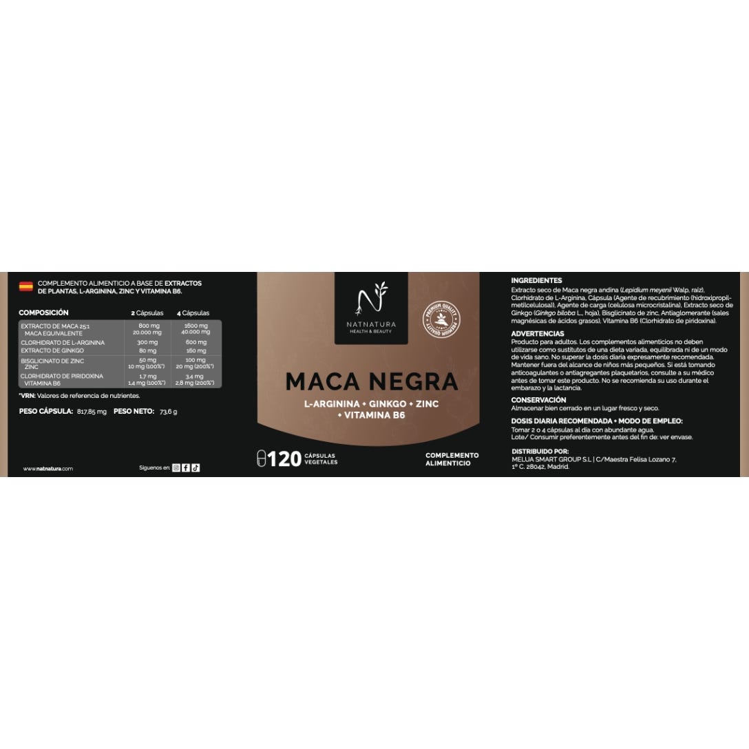 Fórmula premium con maca negra, L-arginina, ginkgo, zinc y vitamina B6 que potencia la energía, el equilibrio hormonal y la vitalidad diaria.