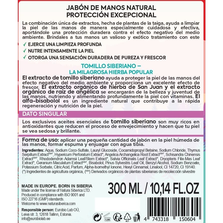 Jabón líquido de manos elaborado a base de extractos de plantas de la taiga. Aporta una limpieza cuidadosa y eficaz con protección duradera. Contribuyen a limpiar la piel y estimular la recarga de vitaminas y minerales. Enriquecido con glicerina, contiene coco glucoside un tensioactivo suave extraído del coco que limpia la piel sin irritar. Es un producto vegano con ingredientes procedentes de granjas orgánicas recolectados a mano. Indicado para todo tipo de pieles.