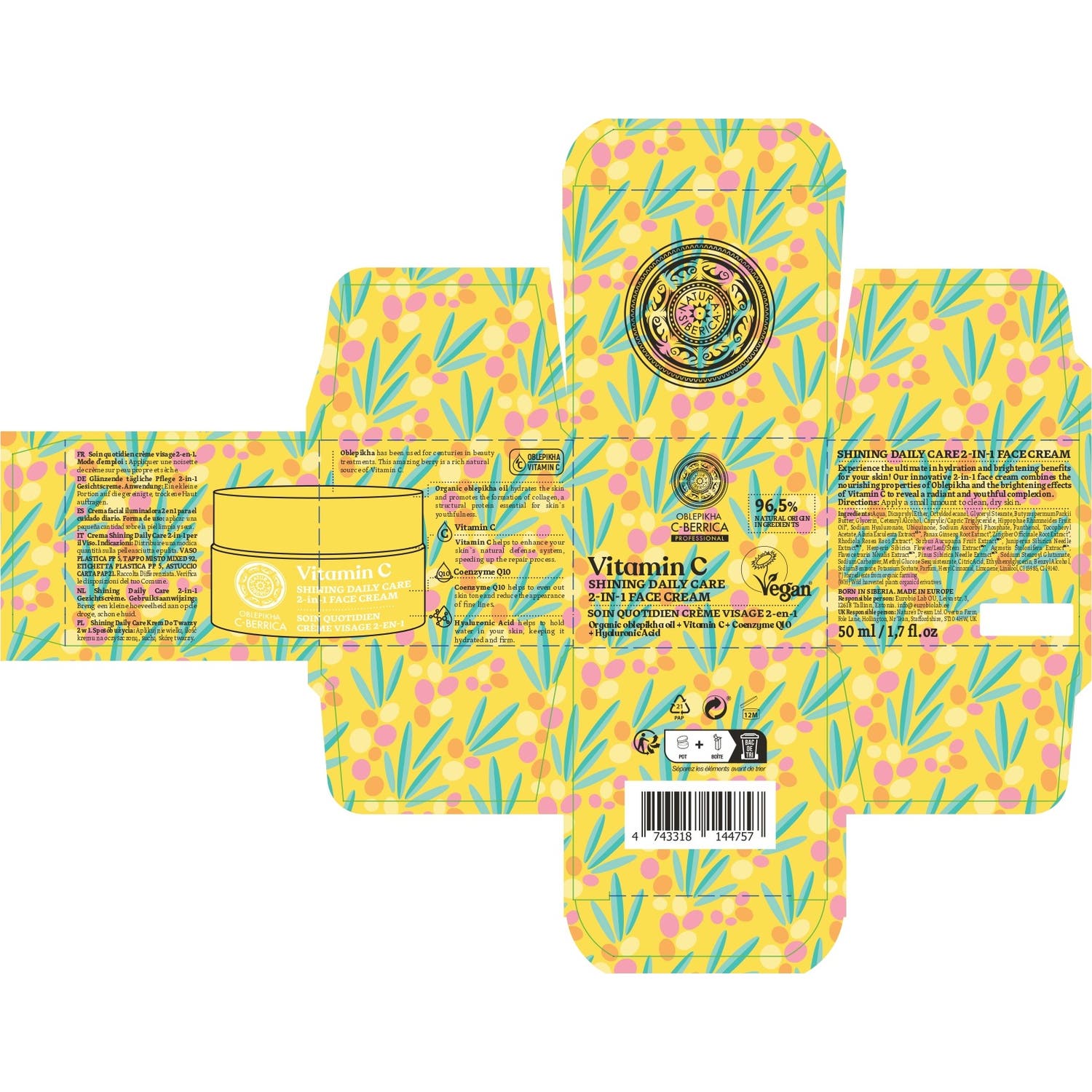 Natura Siberica Oblepikha C-Berrica Vitamin C Shining Daily es una crema facial 2 en 1 diseñada para proporcionar un cutis radiante y juvenil. Este producto combina las propiedades nutritivas del oblepikha con los efectos iluminadores de la vitamina C, ofreciendo una solución eficaz para lograr una piel luminosa y saludable.
