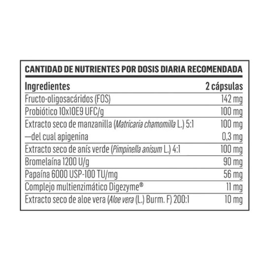 Suplemento alimenticio a base de enzimas, prebióticos y extractos de plantas. Facilita la absorción de los nutrientes procedentes de los alimentos y promueve las digestiones normales. Sus ingredientes tienen propiedades equilibrantes y emolientes. Indicado para adultos.