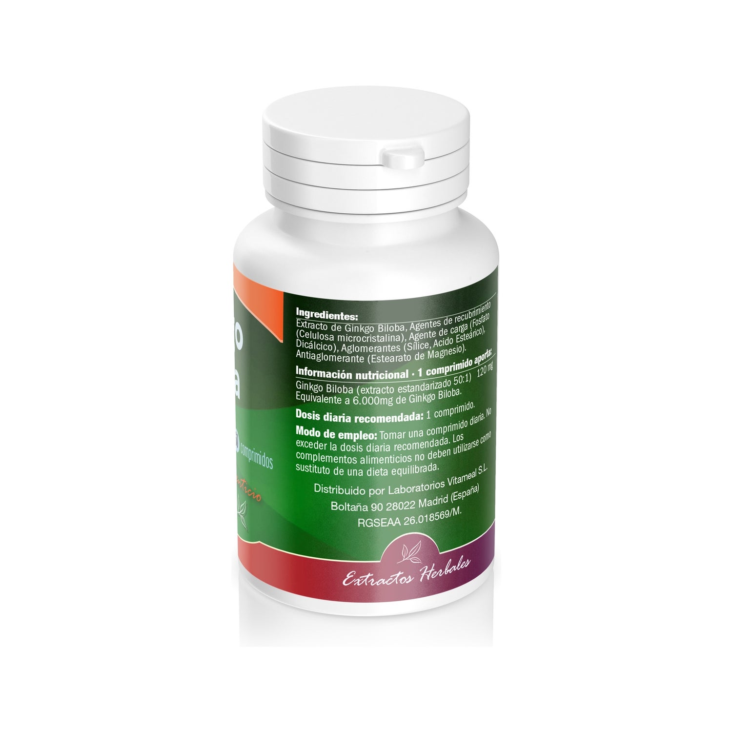 Complemento alimenticio en comprimidos, elaborados con Ginkgo Biloba, de grandes propiedades y beneficios que contribuyen con la salud circulatoria.
