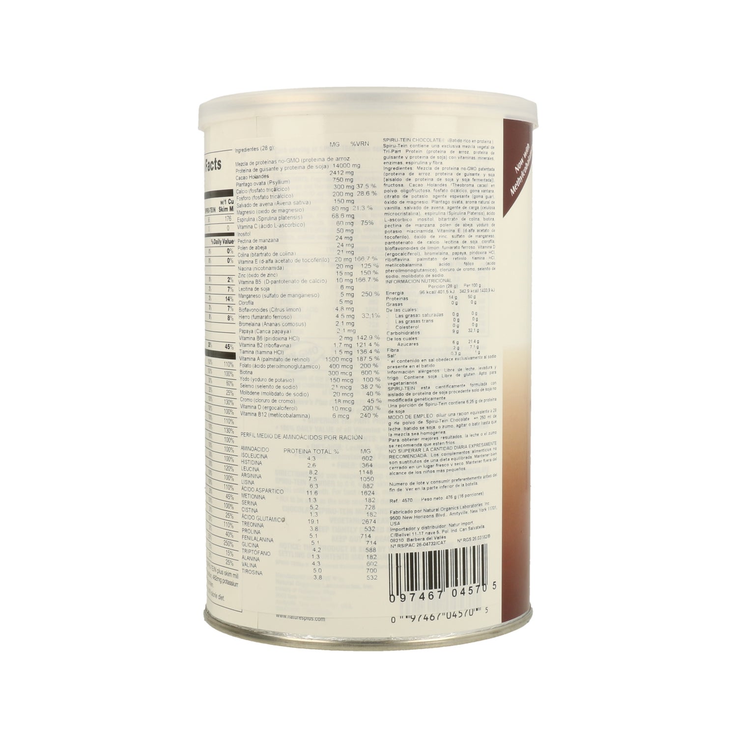 NaturesPlus Spiru-Tein Chocolate 476g es un suplemento alimenticio con una mezcla de proteínas de tres partes: de arroz no transgénico y soja fermentada y no fermentada. Con catorce gramos de proteína, cada ración es un alimento energético rico en nutrientes.