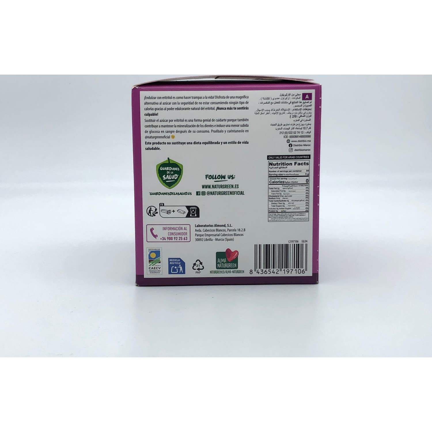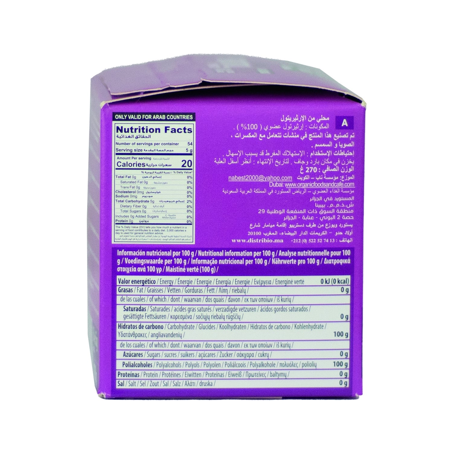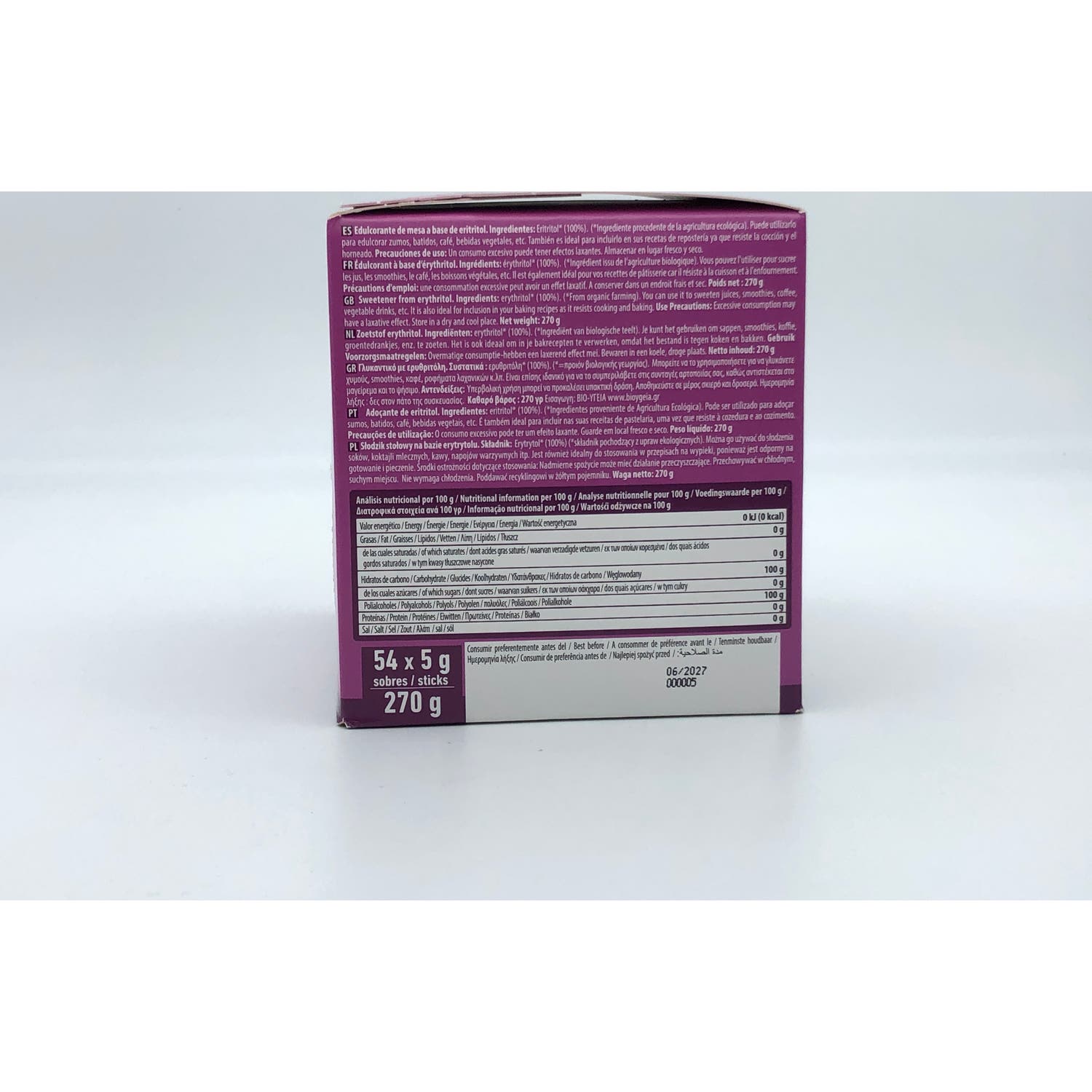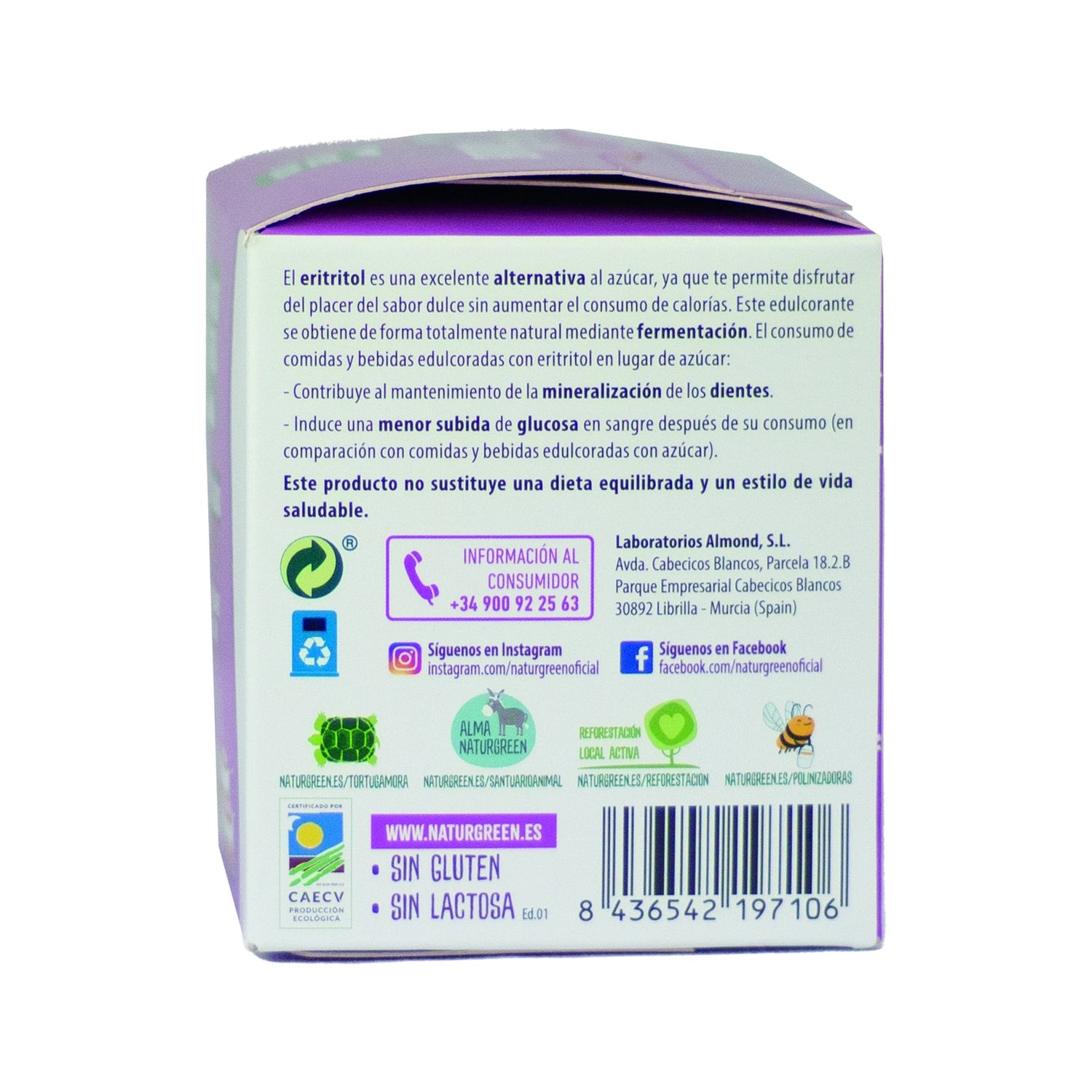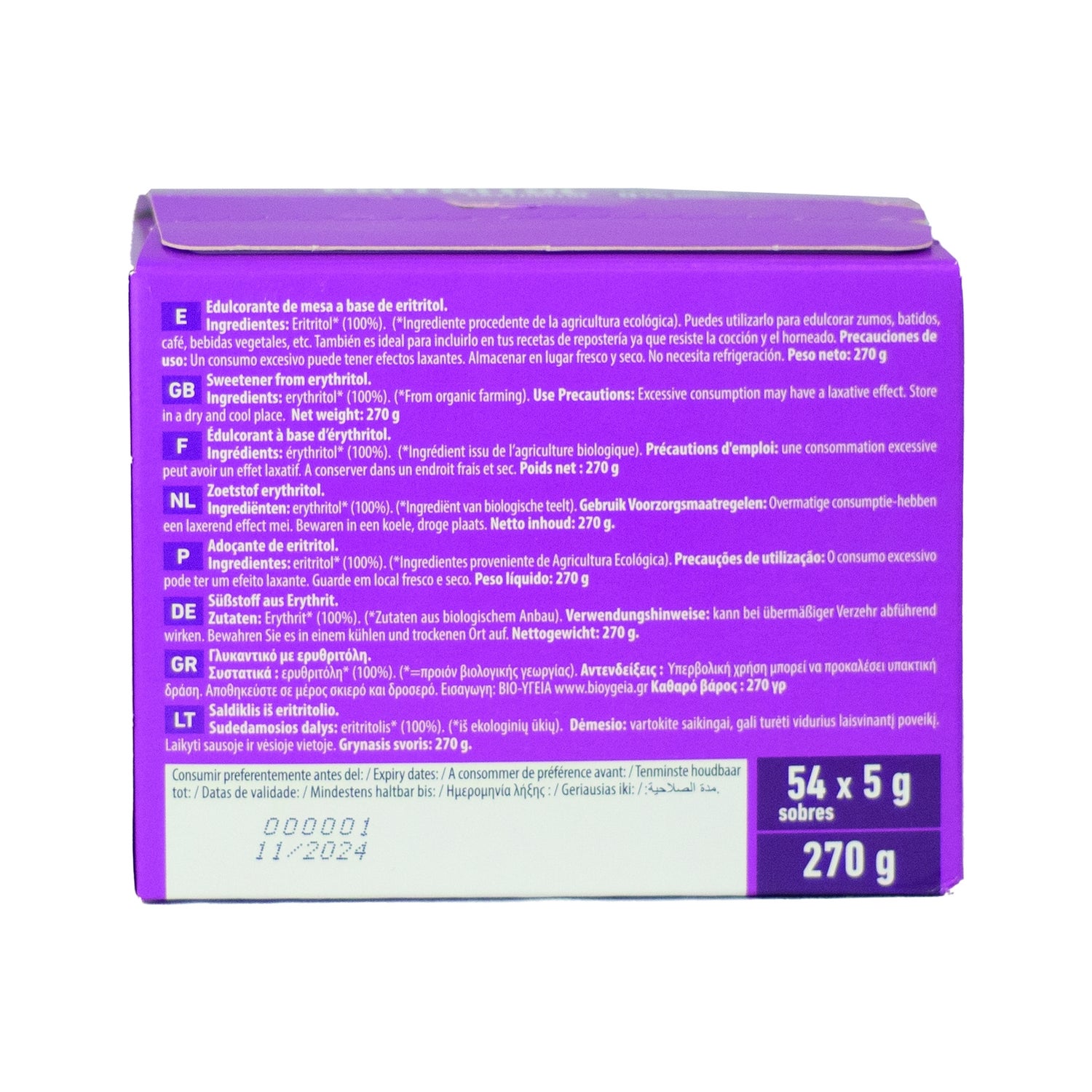 Edulcorante en polvo elaborado a base de 100% eritritol, adecuado como un sustituto al azúcar blanco común y sacarinas. Aporta un poder de endulzar hasta un 70% más que los azúcares tradicionales. Es un compuesto con acción edulcorante, de origen vegetal, recomendado para endulzar zumos, batidos, infusiones, bebidas vegetales y café. También en preparaciones de repostería, ya que es resistente al horneado. Con certificado de producto ecológico. Se presenta en una lata con tapa hermética.