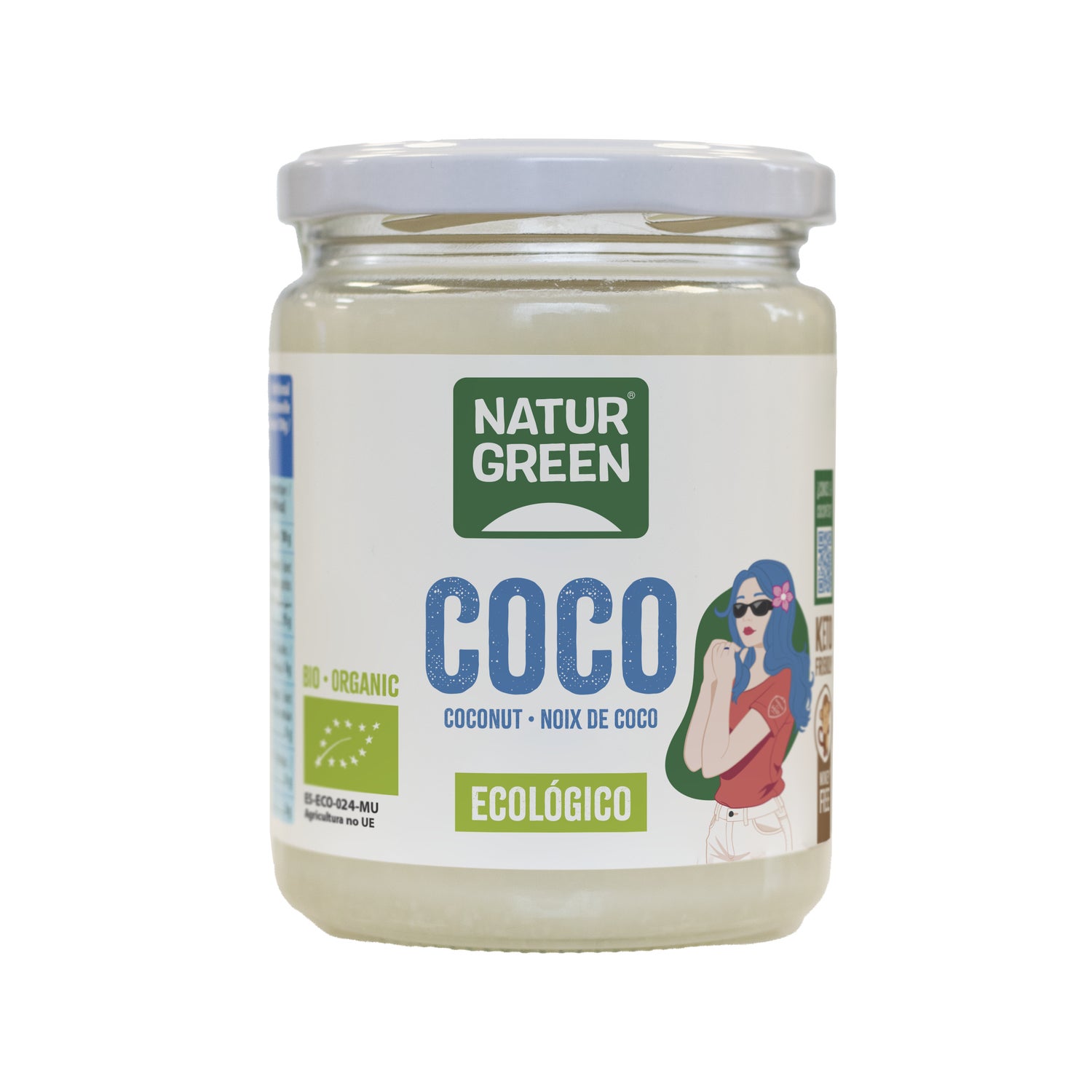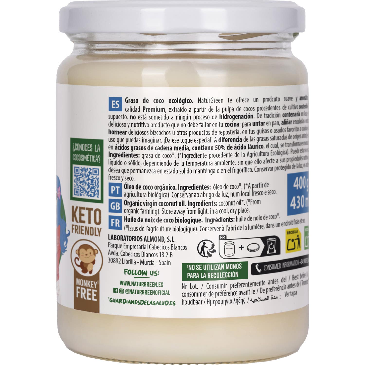 NaturGreen Grasa de Coco Bio 400g es un aceite de coco virgen Naturgreen para uso diario ideal para tener en la cocina o despensa.