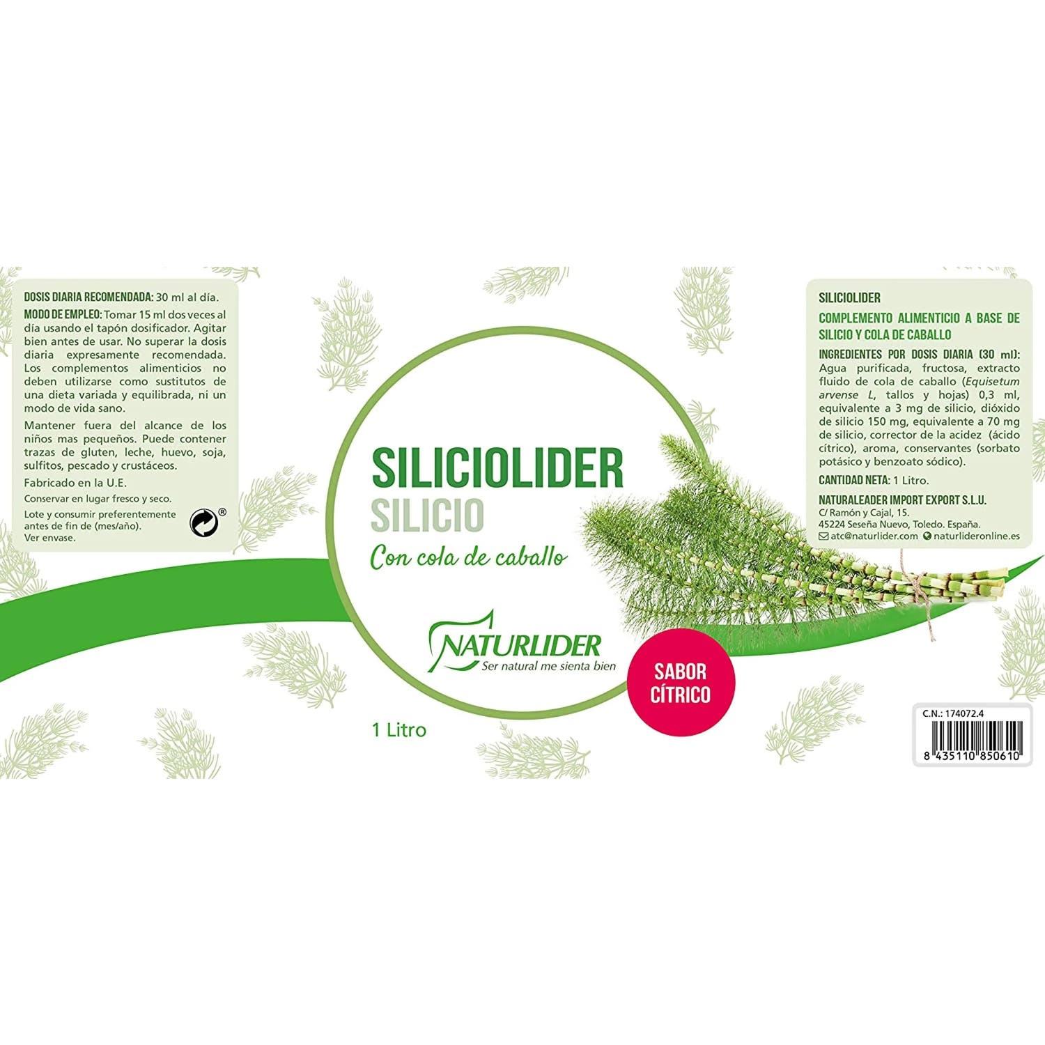 Naturlíder Siliciolíder 1 Litro es un jarabe natural creado para mantener la salud, vitalidad y brillo del cabello. Contiene cola de caballo, que contribuye a reforzar las uñas quebradizas y a mantener una piel saludable y tersa, ayudando a recuperar su elasticidad. Además, es de ayuda en el cuidado de los huesos y las articulaciones.