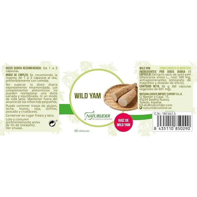 Complemento alimenticio en cápsulas a base de extracto seco de raíz wild yam, también conocida como dioscorea. Favorece el funcionamiento normal del sistema metabólico. Sus ingredientes tienen propiedades reguladoras y equilibrantes gracias a su alto contenido en estrógeno. Indicado para adultos.