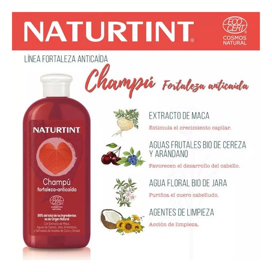 Su fórmula con activos como el extracto de maca, aguas frutales de arándano y cereza y agua floral de jara, ayudan a limpiar, fortalecer y contribuyen a frenar la caída y aumentar la densidad del cabello, a la vez que ayuda a purificar y reconstruir el manto protector del cuero cabelludo, y favoreciendo la microcirculación del mismo mejorando el correcto desarrollo del cabello.