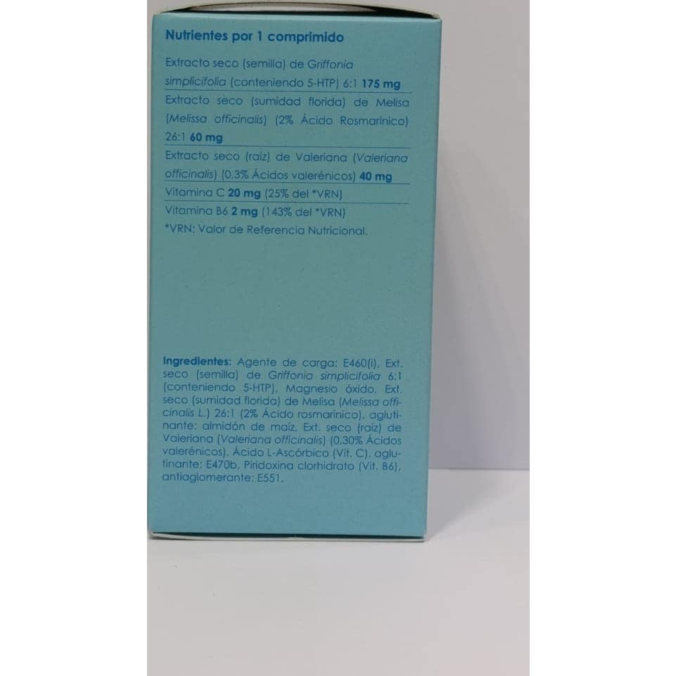 Complemento alimenticio en comprimidos a base de hidroxitriptófano obtenido del extracto de griffonia, melisa y magnesio. Contribuye al funcionamiento normal del sistema nervioso y favorece la regulación del estado de ánimo.