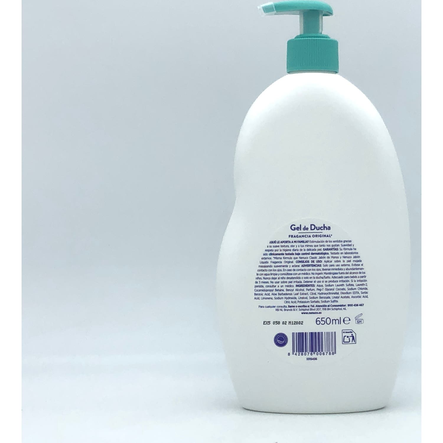 Nenuco Classic Gel de Ducha Fragancia Original 650ml es un gel de baño con la fragancia característica y original de Nenuco, ideal para pieles suaves y delicadas. Su fórmula suave y no irritante ha sido dermatológicamente comprobada, garantizando la seguridad para la piel de los bebés. Contiene extractos de Aloe Vera que favorecen una limpieza e hidratación óptima. Este gel de baño está indicado para uso diario y puede ser utilizado tanto por bebés como por los padres. Para su aplicación, basta con humedecer la piel del bebé, masajear suavemente con el gel y luego enjuagar con abundante agua.