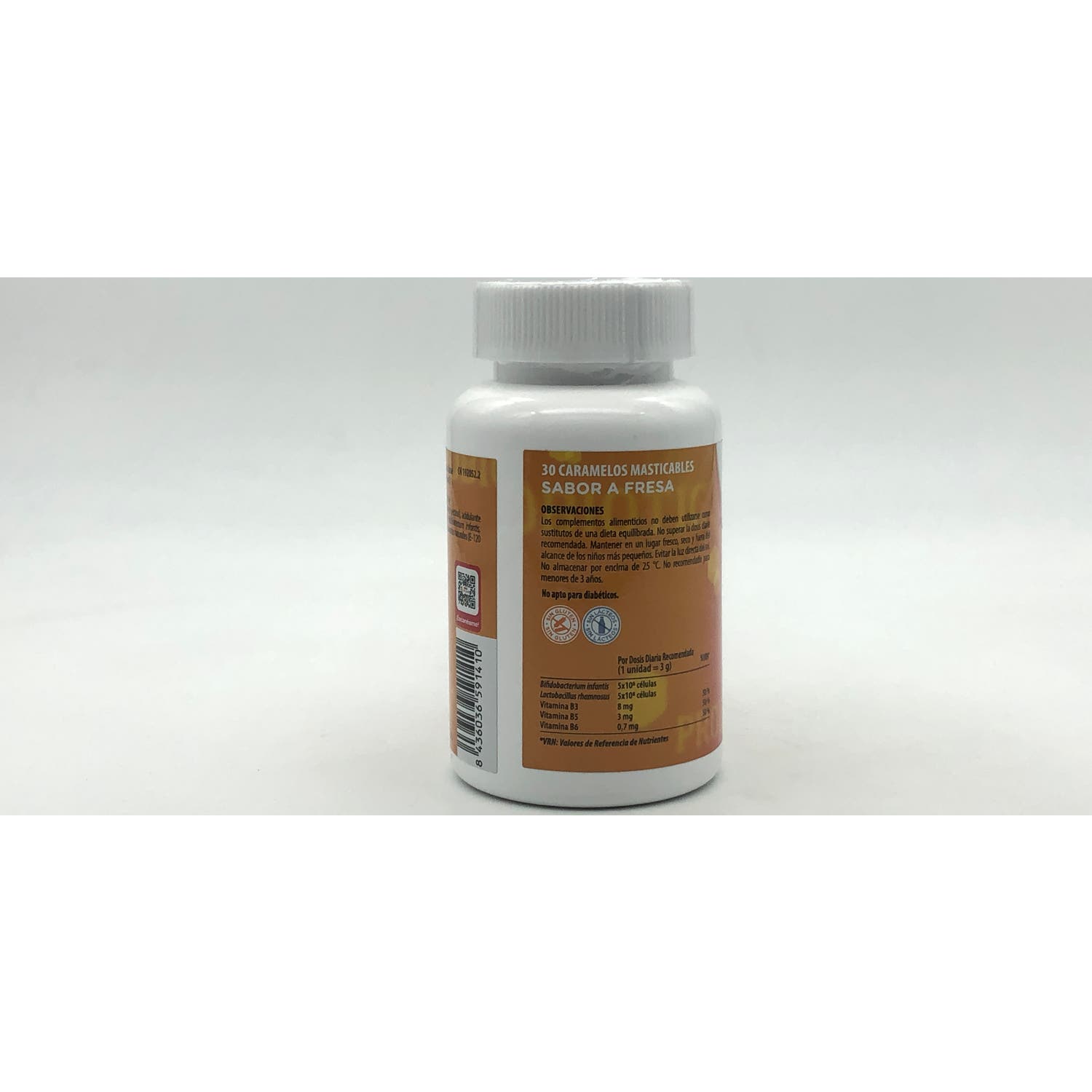 JARABE DE GLUCOSA, AZÚCAR, AGUA, AGENTE DE CARGA (MALTODEXTRINA), GELIFICANTE (PECTINA), ACIDULANTE (ÁCIDO CÍTRICO), NICOTINAMIDA, AROMATIZANTE (AROMA DE FRESA), BIFIDOBACTERIUM INFANTIS, LACTOBACILLUS RHAMNOSUS, PANTOTENATO DE CALCIO, PIRIDOXINA HCL, COLORANTES NATURALES