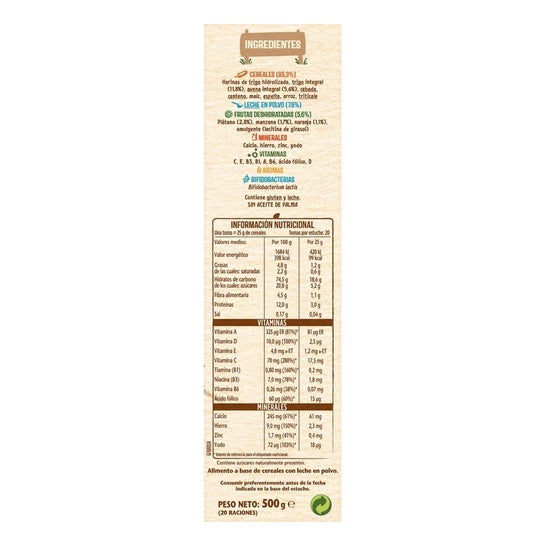 Es una fórmula apta para bebés con trigo y avena integral, cebada, maíz, espelta, arroz, triticale y frutas deshidratadas como plátano, manzana y naranja, entre otros ingredientes. Con vitaminas (C, E, B3, B1, A, B6, ácido fólico y D), hierro, calcio, zinc y yodo. Puede contener leche.