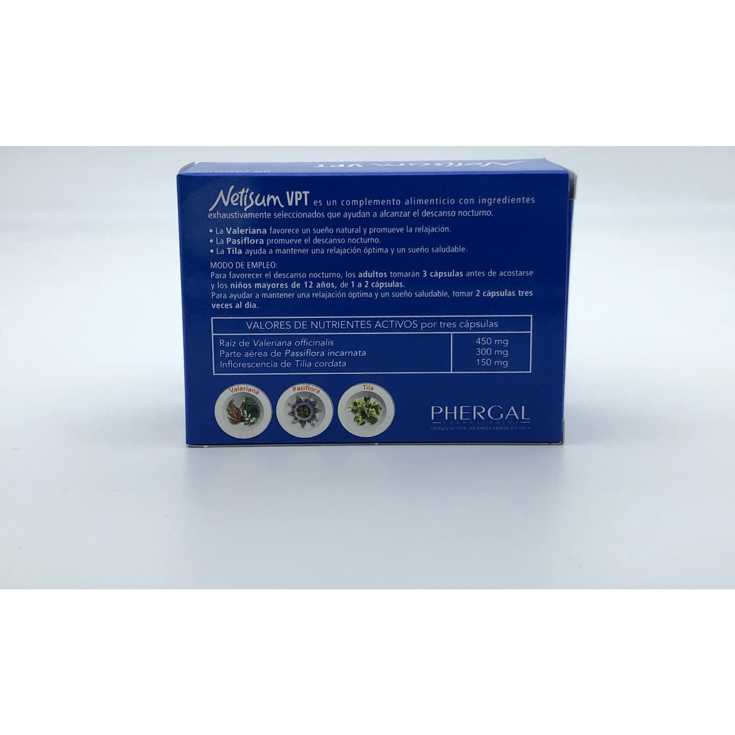 Las cápsulas de Netisum VPT están elaboradas a partir de tisana, valeriana y pasiflora, tres sustancias naturales tradicionalmente usadas para combatir la falta de sueño. Estas cápsulas, elaboradas a partir de activos sedantes y antiespasmódicos, también son útiles en casos de excitación nerviosa e irritabilidad, y no solo para ayudarte a dormir mejor.