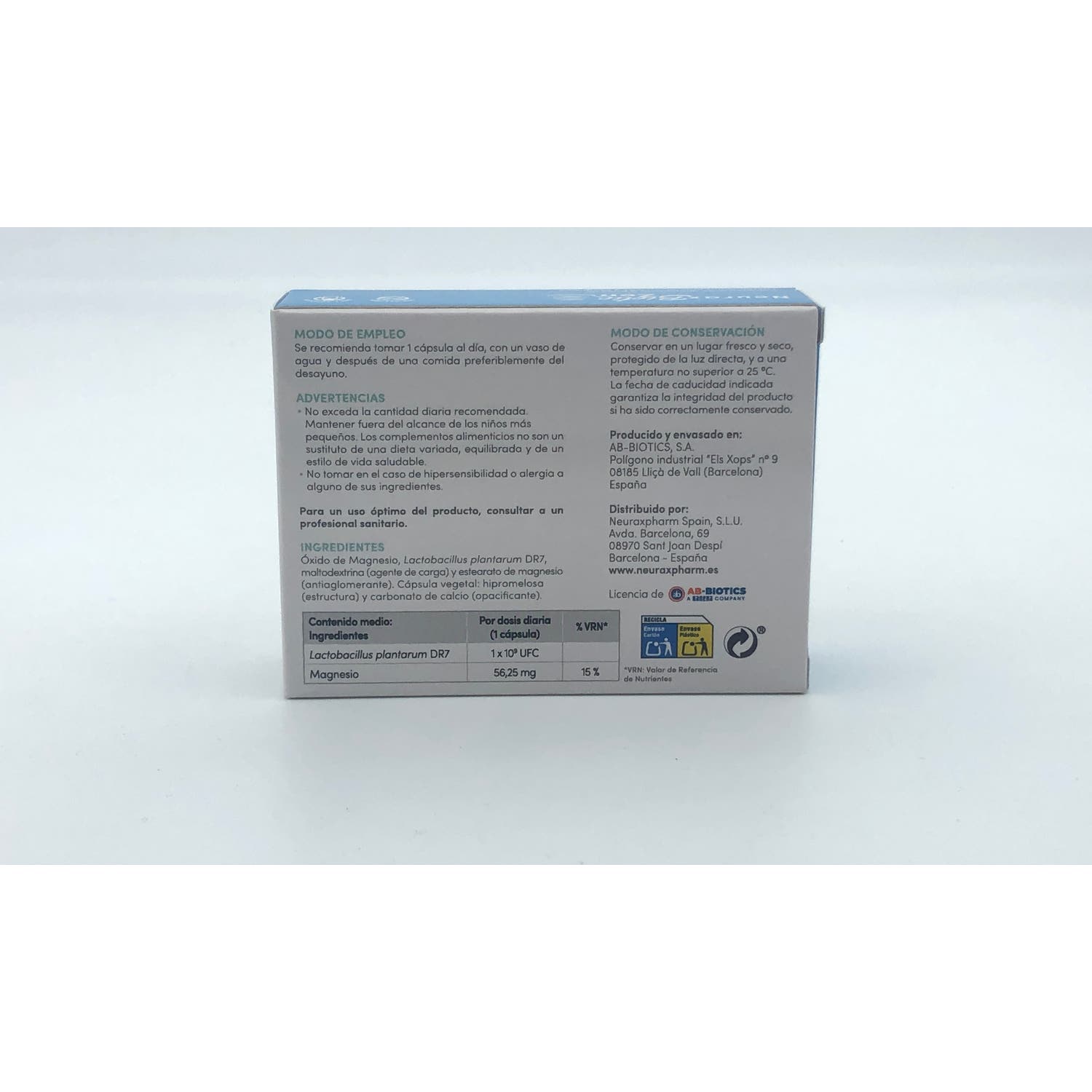 Cada cápsula de NeuraxBiotic Zen® contiene 1x109 UFC de Lactobacillus plantarum DR7 y 56,25 mg de magnesio.