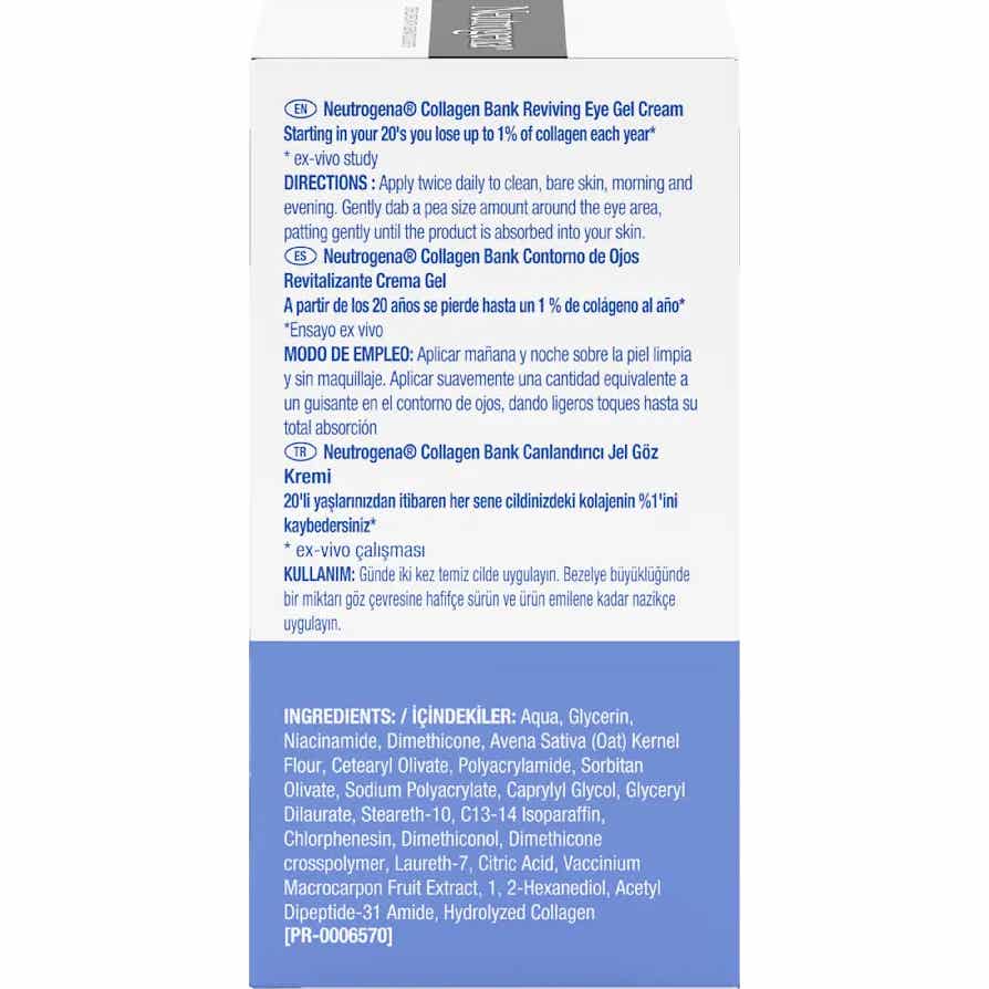 Neutrogena Collagen Bank Contorno de Ojos Revitalizante Crema Gel 15g es una crema diseñada para el cuidado del contorno de ojos. Contribuye a: