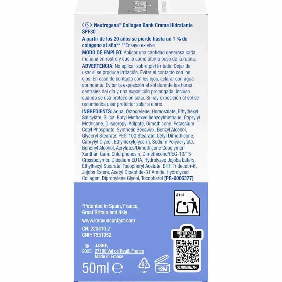 Neutrogena Collagen Bank Crema Hidratante SPF30 50ml es una crema hidratante con acción antiedad y protección solar SPF30.