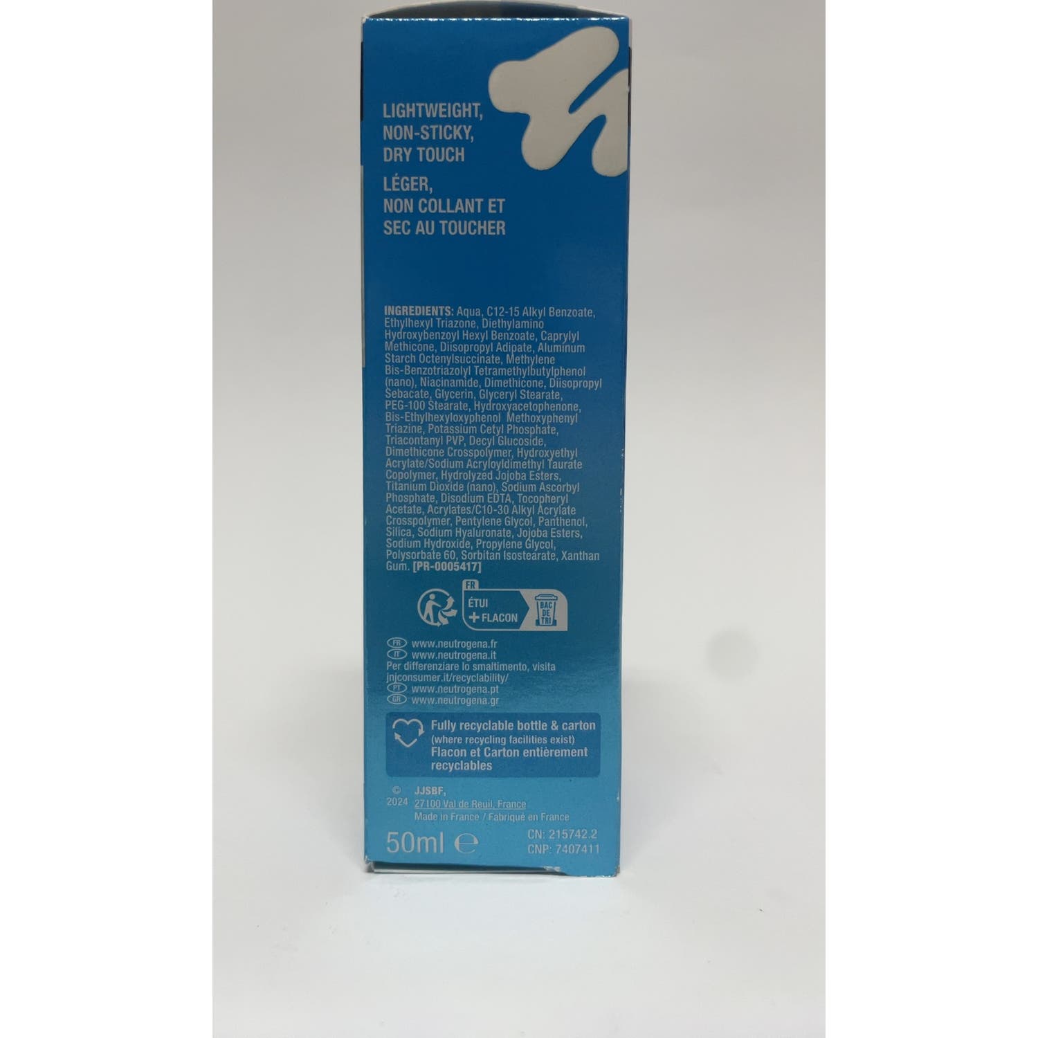 Aqua, C12-15 Alkyl Benzoate, Ethylhexyl Triazone, Diethylamino Hydroxybenzoyl Hexyl Benzoate, Caprylyl Methicone, Diisopropyl Adipate, Aluminum Starch Octenylsuccinate, Methylene bis-benzotriazolyl tetramethylbutylphenol (nano), Niacinamide, Dimethicone, Diisopropyl Sebacate, Glycerin, Glyceryl Stearate, PEG-100 Stearate, Hydroxyacetophenone, Bis-Ethylhexyloxyphenol Methoxyphenyl Triazine, Potassium Cetyl Phosphate, Triacontanyl PVP, Decyl Glucoside, Dimethicone Crosspolymer, Hydroxyethyl Acrylate/Sodium Acryloyldimethyl Taurate Copolymer, Hydrolyzed Jojoba Esters, Titanium Dioxide (nano), Sodium Ascorbyl Phosphate, Disodium EDTA, Tocopheryl Acetate, Acrylates/C10-30 Alkyl Acrylate Crosspolymer, Pentylene Glycol, Panthenol, Silica, Sodium Hyaluronate, Jojoba Esters, Sodium Hydroxide, Propylene Glycol, Polysorbate 60, Sorbitan Isostearate, Xanthan Gum.