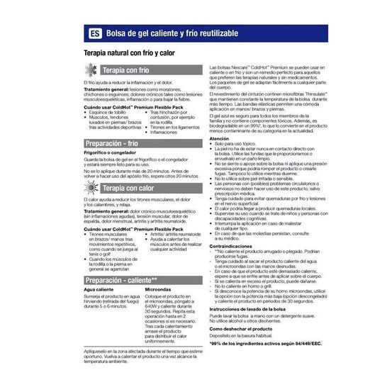 Nexcare ColdHot Premium es una bolsa suave y muy flexible con tejido Thinsulate® (mantiene la temperatura de la bolsa durante más tiempo) y con velcro para sujetarla fácilmente a la zona a tratar. Esta bolsa es totalmente reutilizable y la podrás utilizar tanto en frío como en caliente tantas veces como quieras para aliviar de forma natural y sin analgésicos los dolores musculares. Puede aplicarse de dos modos: