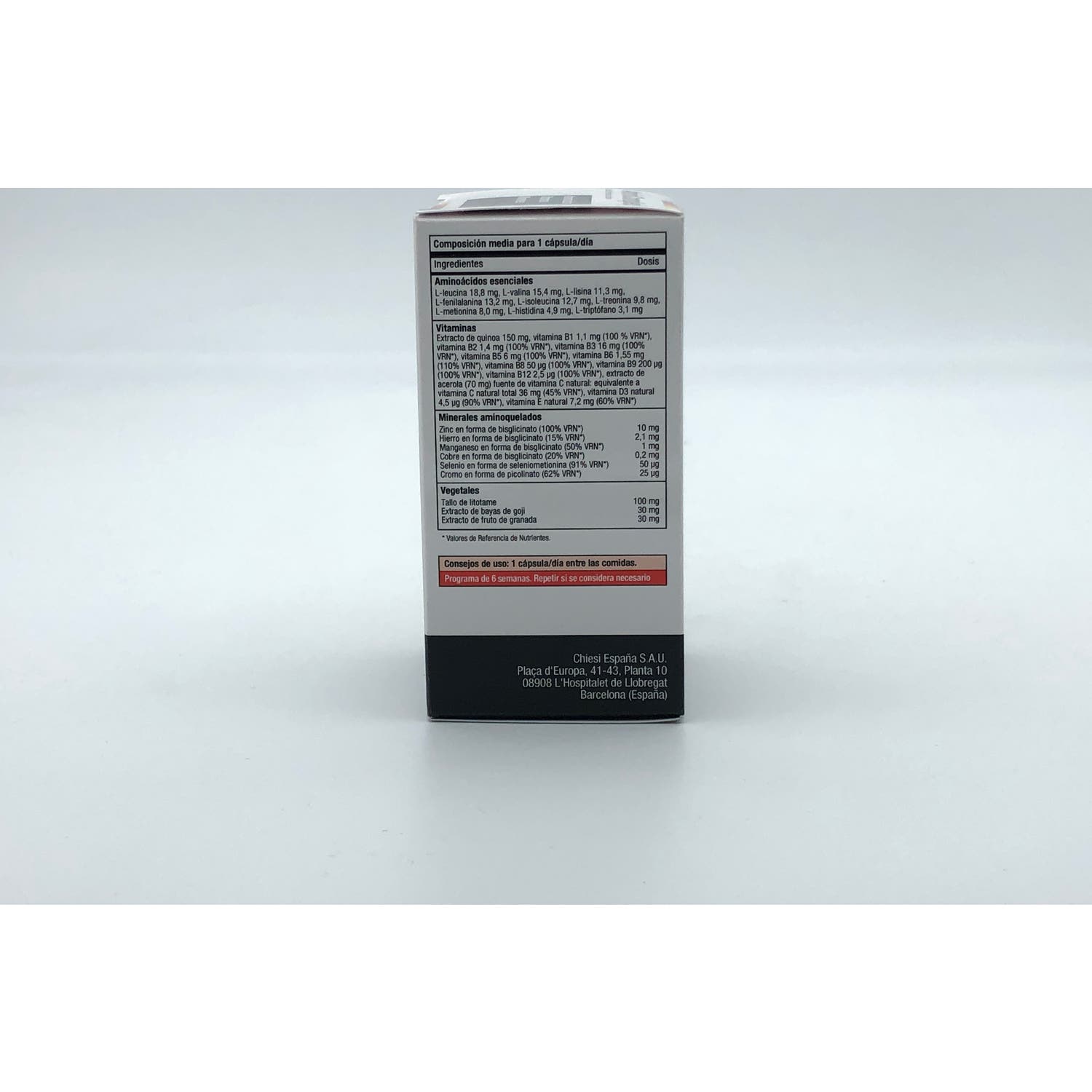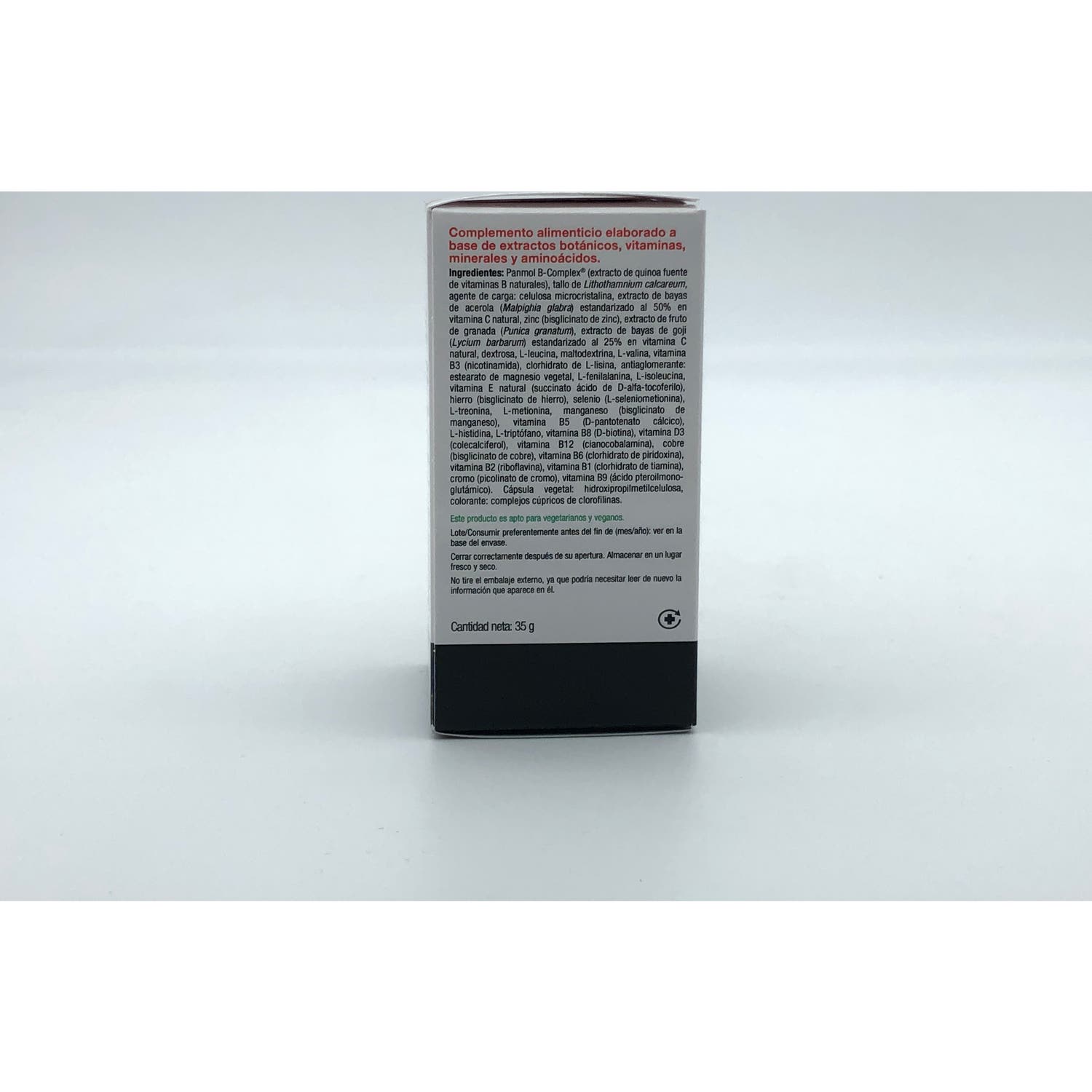 Panmol B-Complex® (extracto de quinoa fuente de vitaminas B naturales), tallo de Lithothamnium calcareum, agente de carga: celulosa microcristalina, extracto de acerola (Malpighia glabra) estandarizado al 50% con vitamina C natural, zinc (en forma de bisglicinato), extracto de granada (Punica granatum), extracto de bayas de goji (Lycium barbarum) estandarizado al 25% con vitamina C natural, dextrosa, L-leucina, maltodextrina, L-valina, vitamina B3 (Nicotinamida), clorhidrato de L-lisina, antiaglomerante: estearato de magnesio vegetal, L-fenilalanina, L-isoleucina, vitamina E natural (succinato ácido de D-alfa-tocoferol), hierro (en forma de bisglicinato), selenio (en forma de selenometionina), L-treonina, L-metionina, manganeso (en forma de bisglicinato), vitamina B5 (D-pantotenato de calcio), L-histidina, L-triptófano, vitamina B8 (biotina), vitamina D3 (colecalciferol), vitamina B12 (cianocobalanina), cobre (en forma de bisglicinato), vitamina B6 (clorhidrato de piridoxina), vitamina B2 (riboavina), vitamina B1 (clorhidrato de tiamina), cromo (en forma de picolinato), vitamina B9 (ácido fólico). Cápsula: hidroxipropilmetilcelulosa, colorante: complejos cúpricos de clorolinas.
