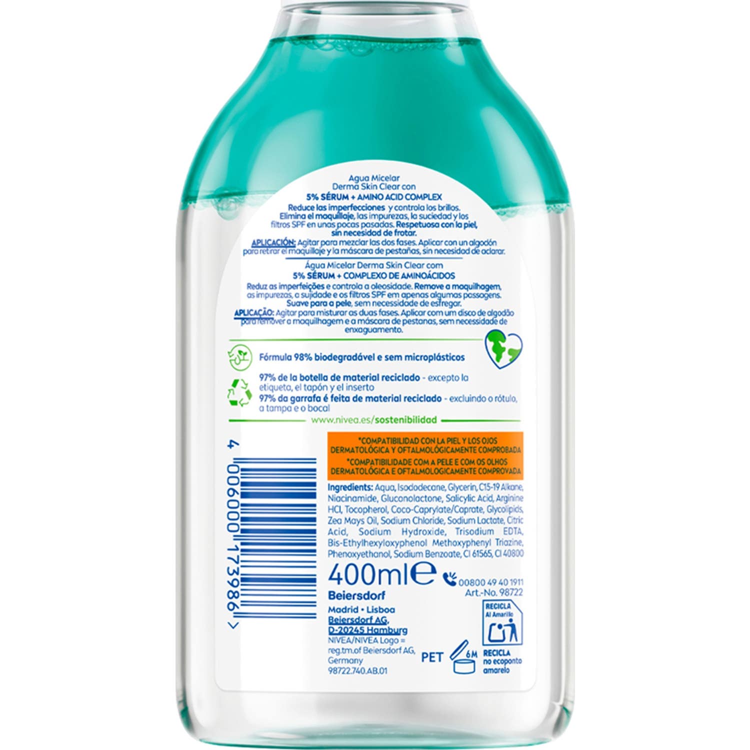 Nivea Agua Micelar Derma Skin Clear Anti-Imperfecciones es un producto diseñado para proporcionar una limpieza suave y eficaz, especialmente formulado para combatir las imperfecciones de la piel. Esta agua micelar es adecuada para todos los tipos de piel, incluyendo aquellas más sensibles.