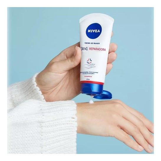 Nivea Crema de Manos Reparadora 100 ml es un tratamiento para manos muy secas que contiene dexpantenol, ideal para reparar en profundidad las manos agrietadas, dejándolas suaves y nutridas. Proporciona una sensación de alivio inmediato y protege las manos de factores externos dañinos. Su absorción es rápida, sin dejar residuos grasos.