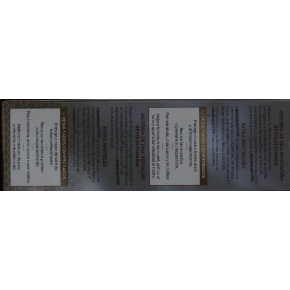 Más de diez años de investigación y ensayos con más de 50 000 ingredientes han llevado a Nivea a conseguir esta innovadora y revolucionaria crema. Ha descubierto el Ingrediente Luminous630, que activa la regeneración celular. Sus resultados son excepcionales, pues protege del sol y sus rayos, a la vez que hidrata y tonifica sin dejar brillante la piel facial. Mejora la textura de la piel y unifica el tono.