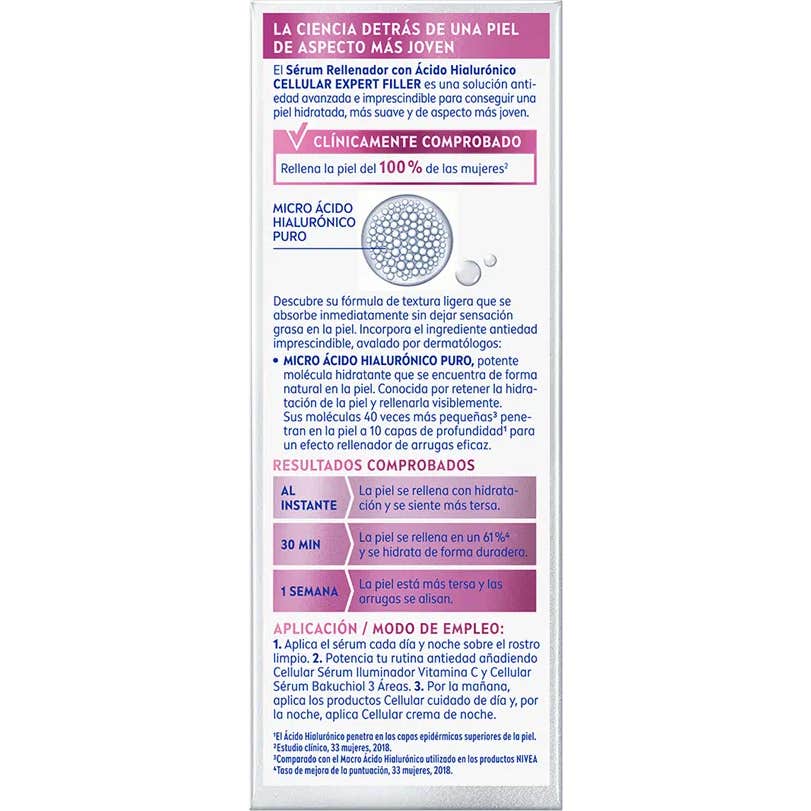 Nivea Expert Filler Cellular Ácido Hialurónico Sérum Rellenador 30ml es un tratamiento avanzado diseñado para proporcionar una solución antiedad eficaz. Este sérum se destaca por su capacidad para rellenar la piel en tan solo 20 segundos, ofreciendo un efecto inmediato que suaviza visiblemente las arrugas en una semana.