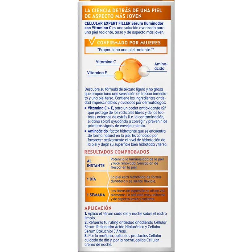 Nivea Expert Filler Cellular Sérum Iluminador Vitamina C es un tratamiento avanzado diseñado para ofrecer una piel radiante, suave y con un aspecto rejuvenecido. Este sérum cuenta con una fórmula enriquecida que combina Vitamina C, Vitamina E y aminoácidos, proporcionando propiedades antioxidantes y beneficios antienvejecimiento.