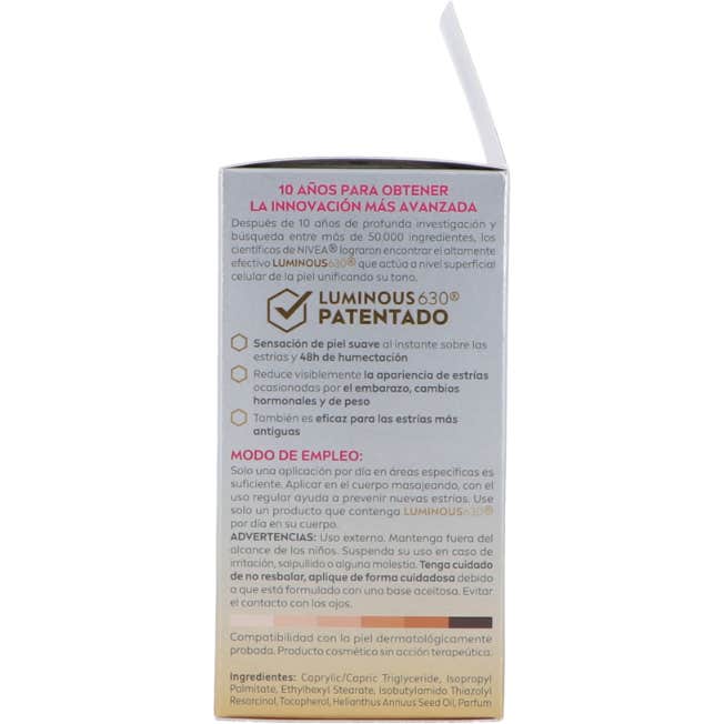 Nivea Luminous 630º Antimanchas Sérum Antiestrías 100ml es un sérum corporal diseñado para unificar el tono de la piel y reducir la visibilidad de las estrías. Su fórmula innovadora incluye el ingrediente patentado LUMINOUS630®, que comienza a actuar desde el primer día de uso, ofreciendo resultados visibles en tan solo dos semanas.