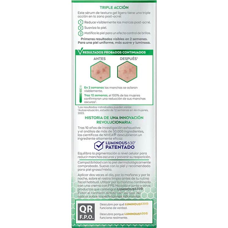 Nivea Luminous 630º Antimanchas Sérum Marcas Post-Acné 30ml es un producto diseñado para abordar las marcas oscuras que quedan tras el acné. Este sérum, con una textura ligera en gel, promete reducir visiblemente estas marcas en tan solo dos semanas, al mismo tiempo que proporciona un efecto matificante en la piel.