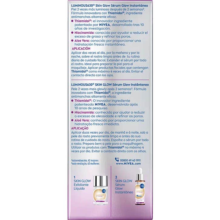 Nivea Luminous 630º Skin Glow Sérum Glow Instantáneo 30ml es el primer sérum de la marca que aborda de manera integral las diferentes dimensiones del brillo en la piel. Este producto está diseñado para proporcionar: