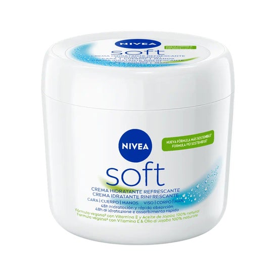 Nivea Soft se presenta en un práctico formato de 500 ml, ideal para un uso diario en cara, cuerpo y manos. Su aplicación permite disfrutar de una sensación refrescante y de una piel hidratada durante todo el día.